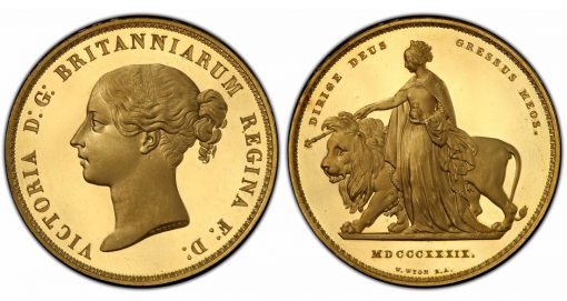 - 1839 Victoria Young Head set in gold, silver and copper. One of the most famous proof sets of England, with a mintage of 300.