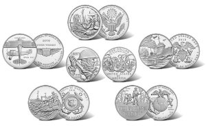 The silver medals commemorate branches of the U.S. Armed Forces that were active in the First World War with designs honoring the Army, the Navy, the Air Service, the Marines and the Coast Guard.
