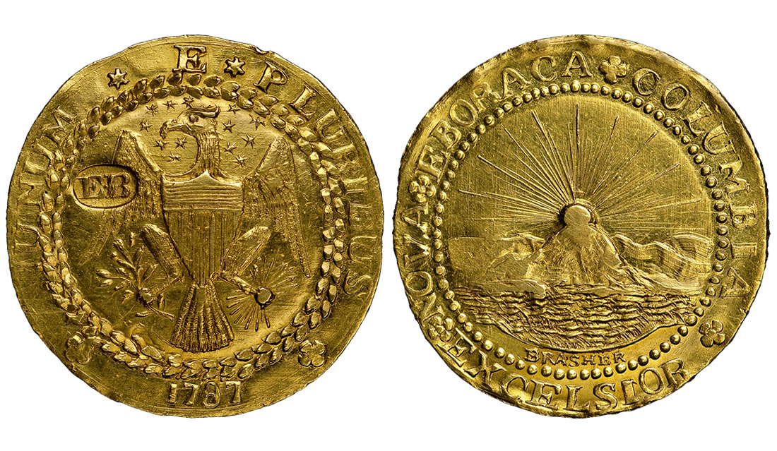 The front of the coin features a sun rising over a mountain peak and the sea, with Brasher’s name spelled out below the waves and the words NOVA EBORACA COLUMBIA EXCELSIOR, which translates to "New York, America, Ever Higher." Excelsior remains the state motto to this day.