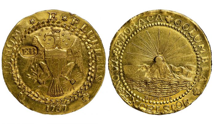 The 1787 DBLN Brasher Doubloon, MS63 NGC. CAC., is the finest certified of seven such coins known to exist. Heritage Auctions sold the coin in January 2014 for $4.58 million, then a record auction price for the coin.