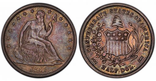 The CSA half dollar is graded PCGS Gold Shield SP40 CAC. Some researchers believe it may have been owned in the 1860s by CSA Secretary of the Treasury Christopher Memminger and perhaps Confederacy President Jefferson Davis, then reportedly was found in a roll of change around 1880 by a collector, Mark Jacobs, in the state of New York. Twentieth century owners included Thomas Elder, Waldo Newcomer, B. Max Mehl, Col. E.H.R. Green and Newman.
