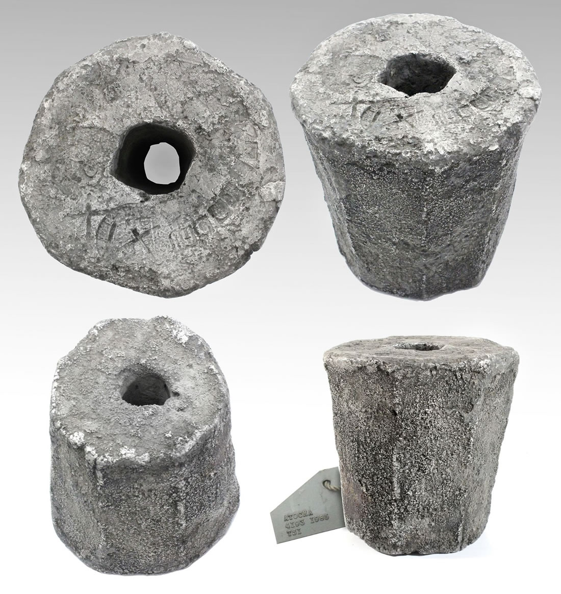 The other two large bars, with Class Factors 0.7 and 0.9, are estimated at $20,000 to $30,000 each. Another Atocha ingot of note in this auction is a rare cylindrical "piña" weighing 4,312 grams, estimated at $15,000 and up.