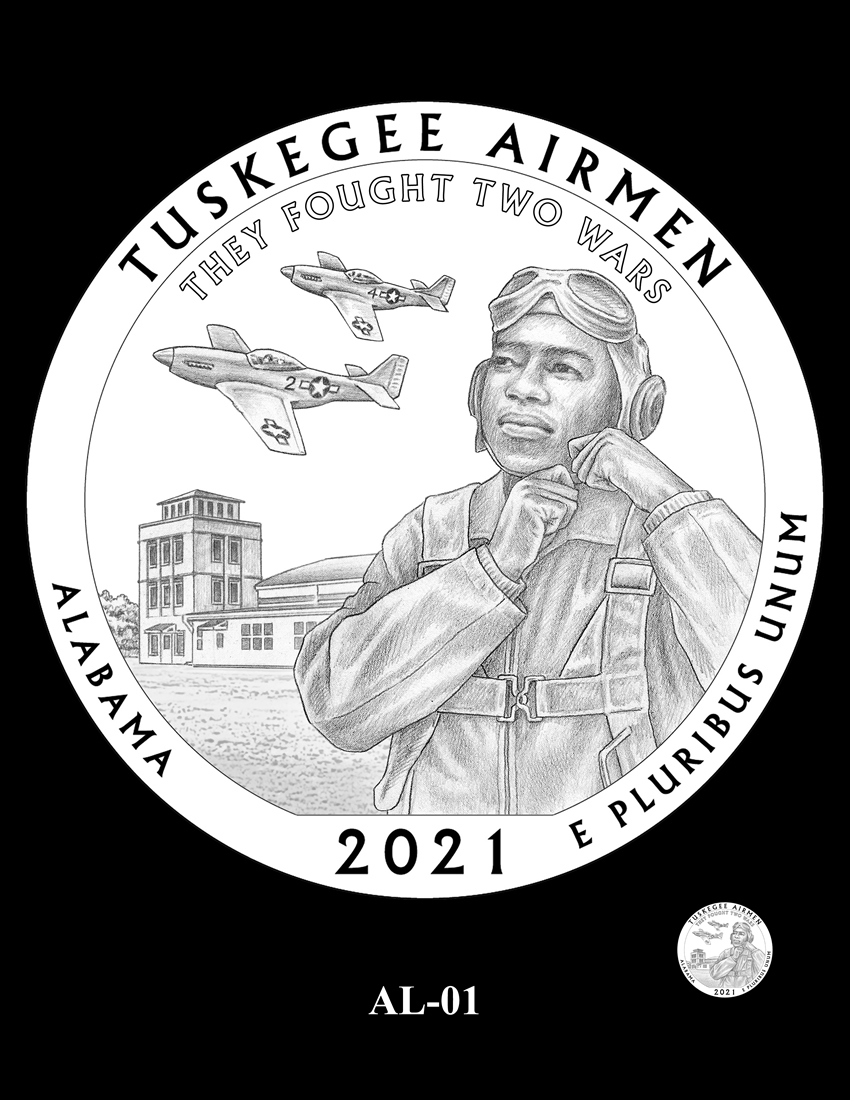 AL-01 depicts a Tuskegee Airman pilot suiting up to join the fight during World War II with the Moton Field control tower in the background. The pilot looks upward with pride and confidence as two P-51 Mustangs pass overhead. The inscription "THEY FOUGHT TWO WARS" is arced across the top as a reference to the dual battles the Tuskegee Airmen fought – fascism abroad and racial discrimination at home.