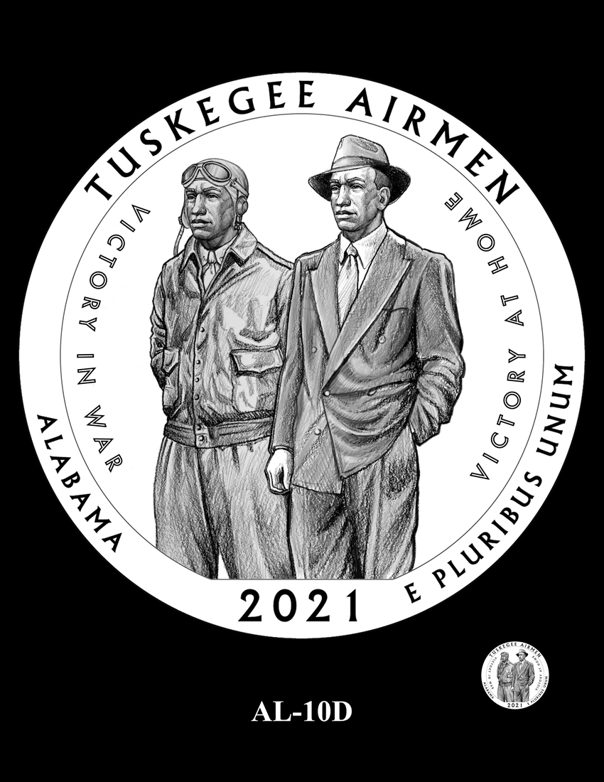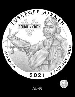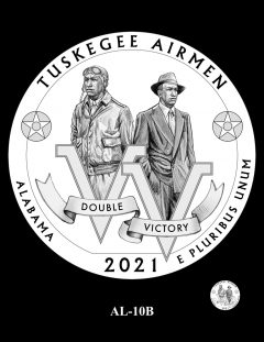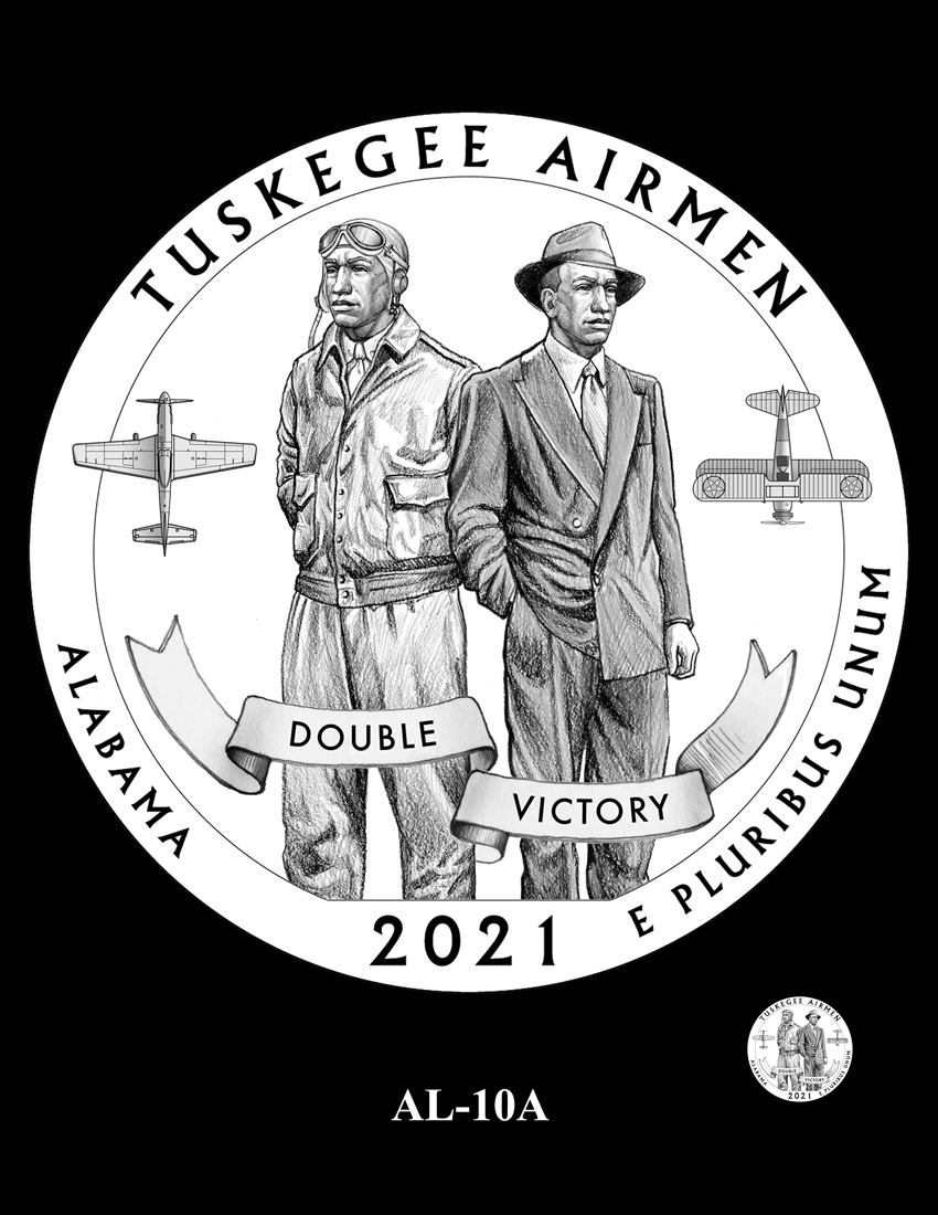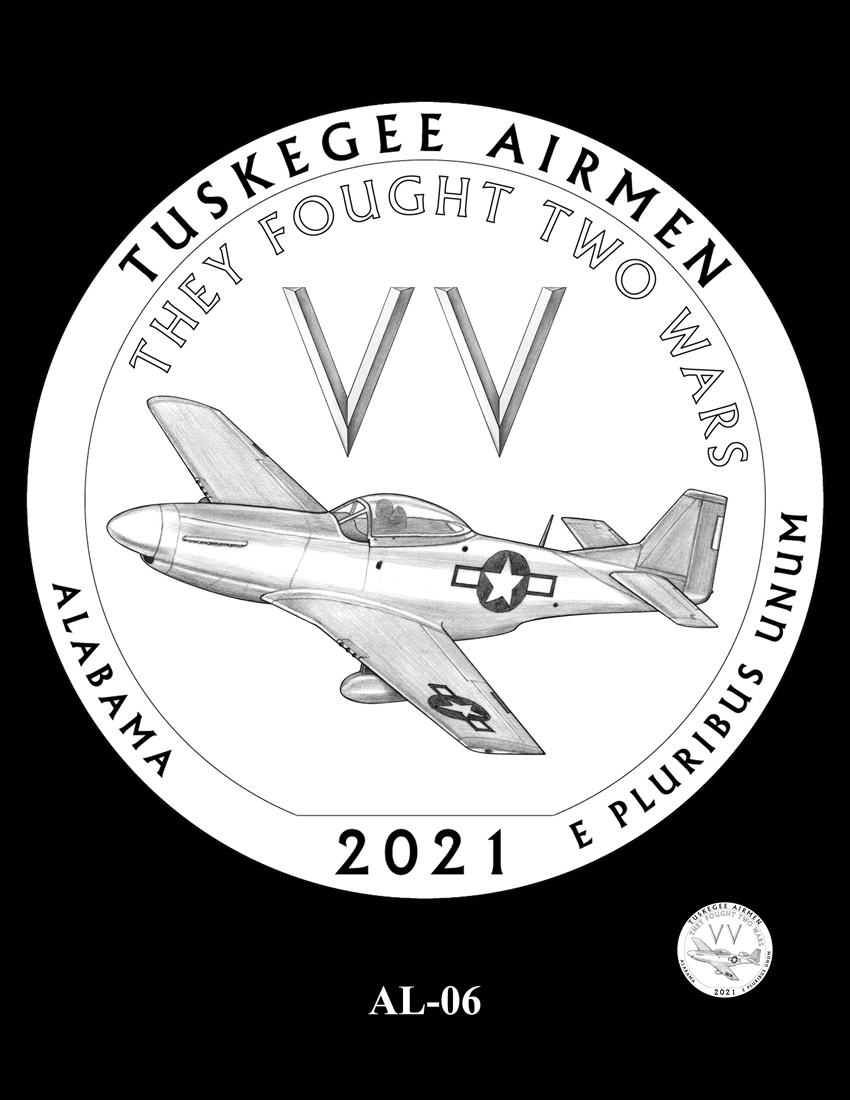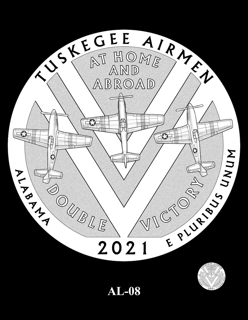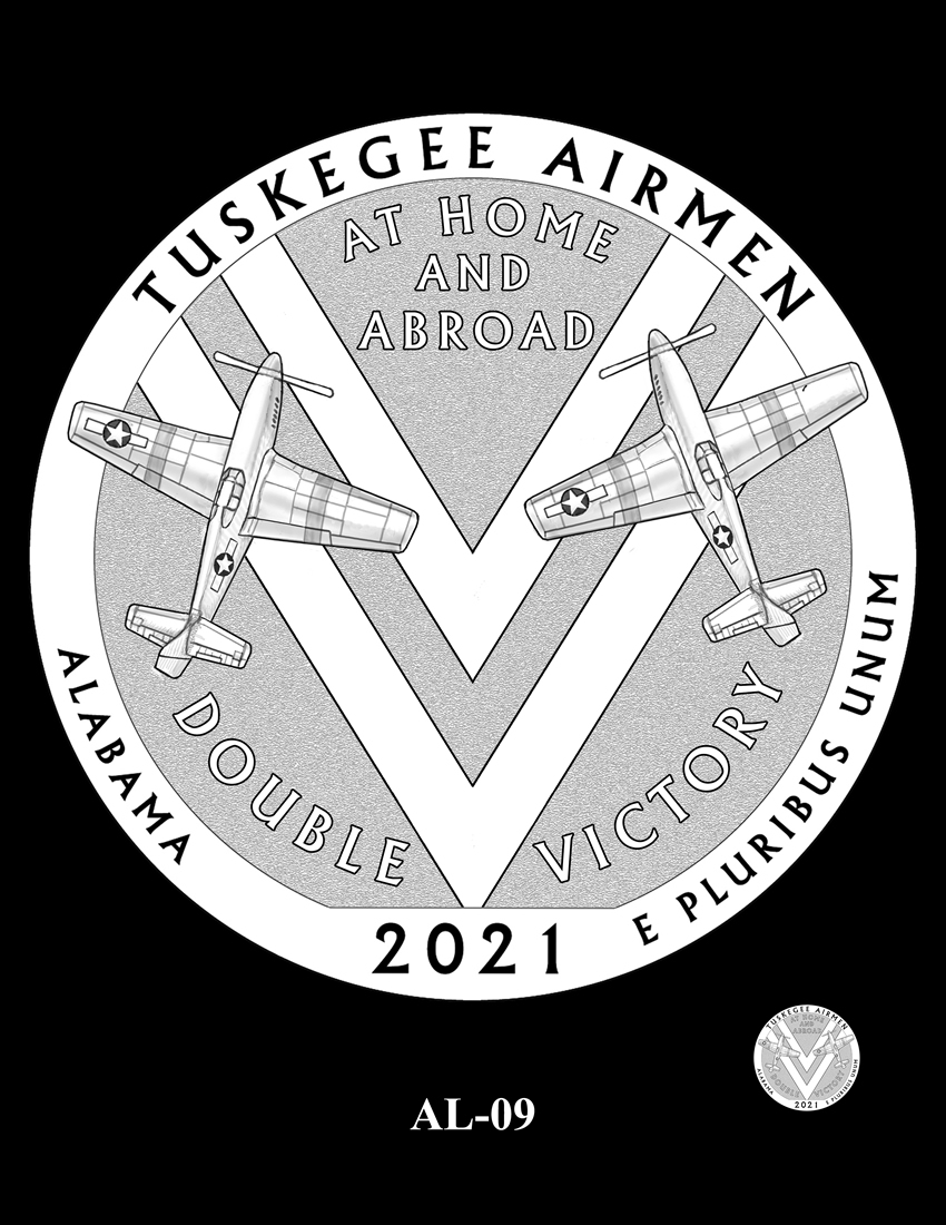 AL-08 and AL-09 portray P-51 Mustangs, the primary battle aircraft used by the Tuskegee Airmen, flying overhead. The planes are interlaced with a symbolic double V. Inscriptions included are "AT HOME AND ABROAD" and "DOUBLE VICTORY." TWO WARS" is arced across the top.
