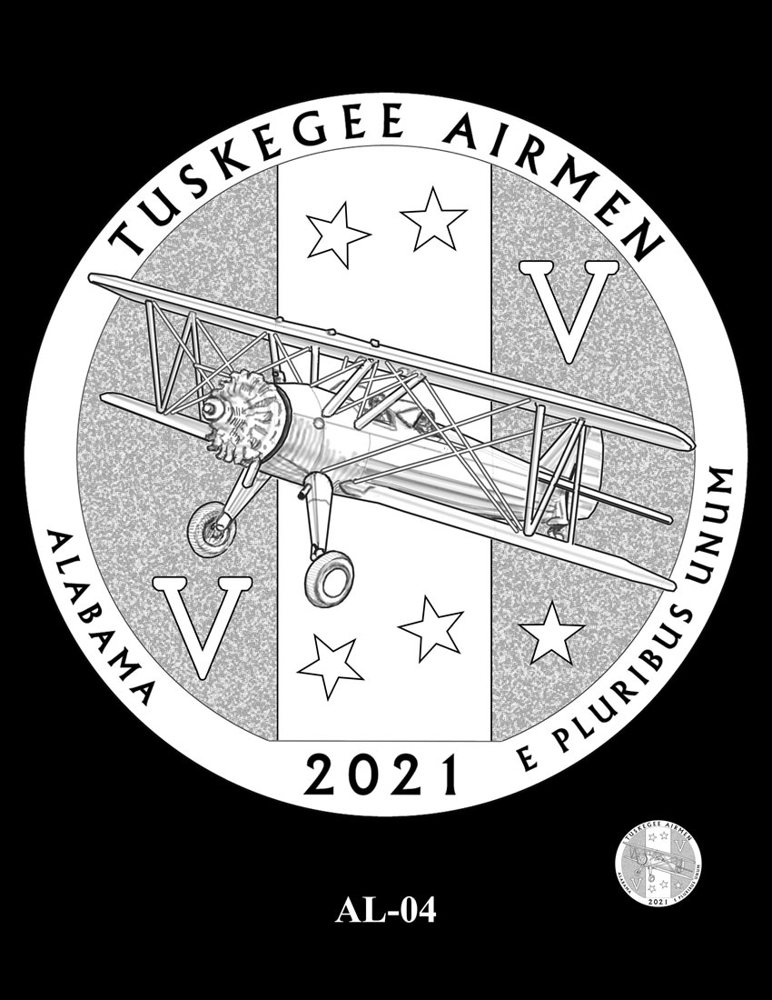 AL-04 portrays a PT-17 Stearman, an aircraft used by The Tuskegee Institute to train pilots. The background contains the symbolic double V. Five stars represent the five graduates from the very first class of Tuskegee Airmen.