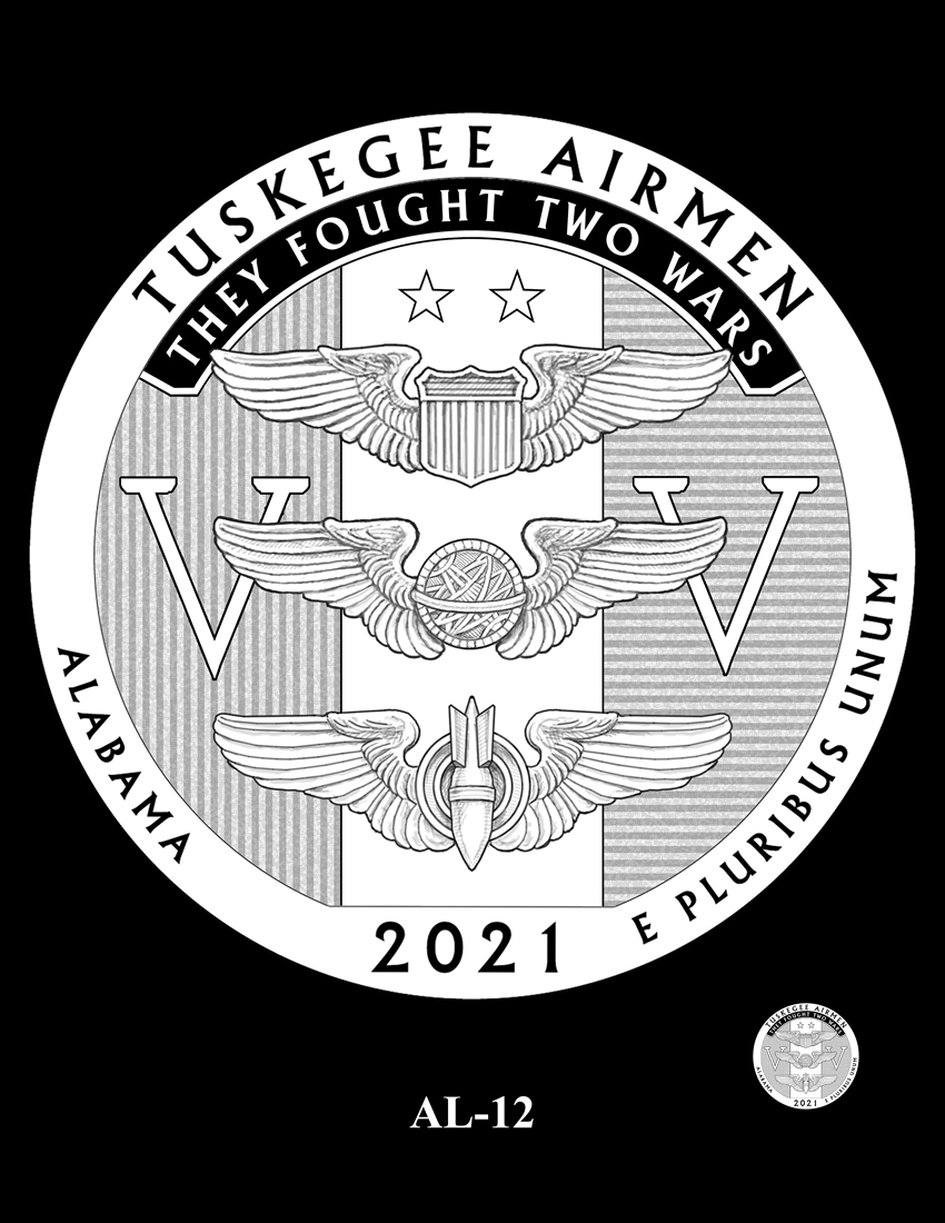 AL-12 depicts Pilot, Navigator, and Bombardier wings representing some of the many specialties achieved by Tuskegee Airmen. They are superimposed over the familiar double V design. Borrowing from heraldry, the left side of the field utilizes vertical stripes to indicate the color red, representing warriors and military strength. The right panel of horizontal lines indicates the color blue, representing truth and loyalty. Together with the center panel, depicting white by the smooth texture, they represent the American flag. The inscription "THEY FOUGHT TWO WARS" is centered across the top of the design.