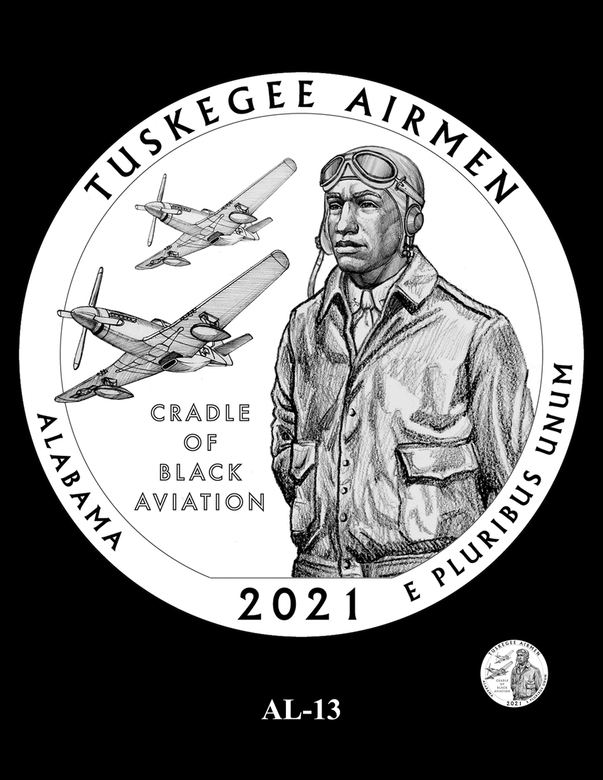 AL-13 depicts a Tuskegee Airmen suited up for flight with two P-51 Mustangs flying in the background. The inscription "CRADLE OF BLACK AVIATION" completes the design.