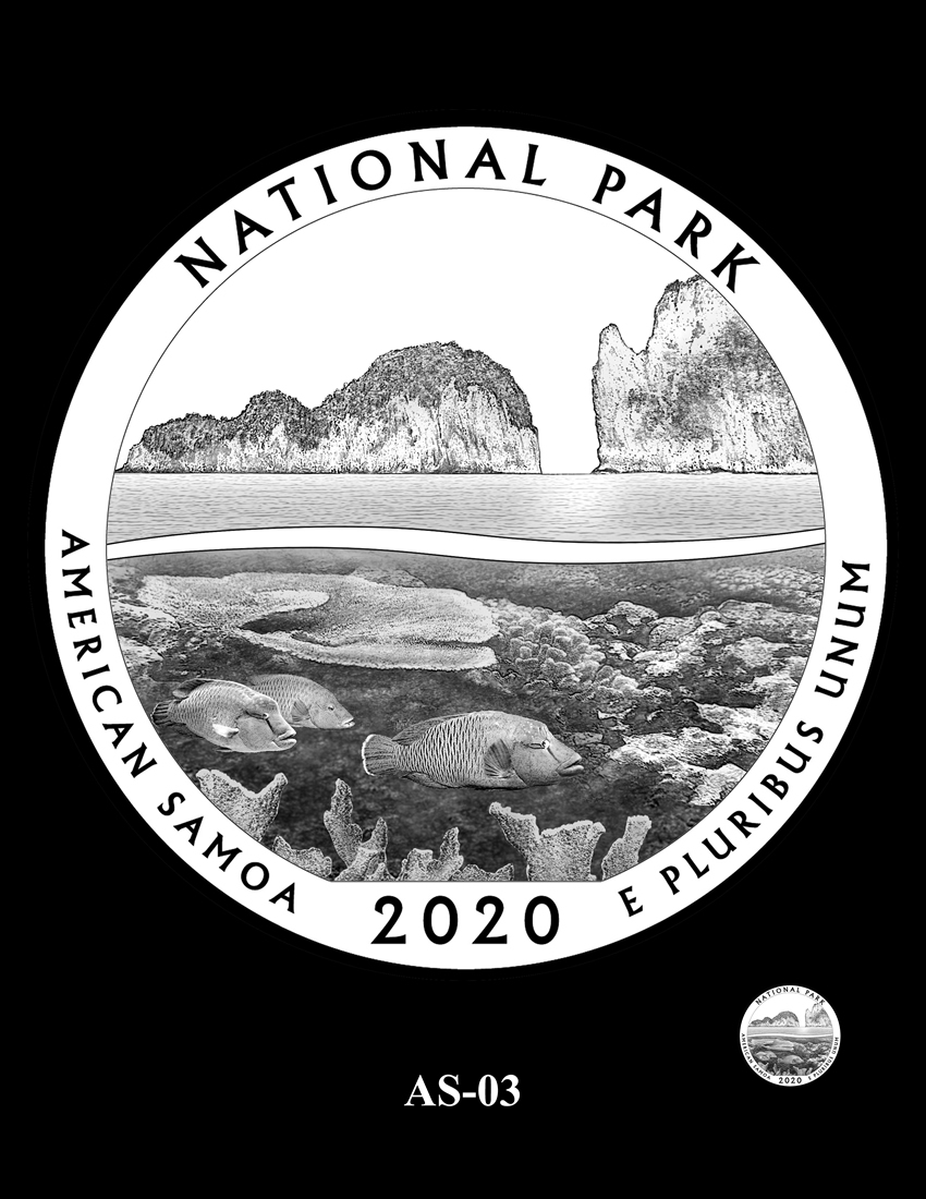 AS-03 depicts a divided-view, with the top half of the design featuring the northern tip of the park looking east, with Pola Island to the left. Beneath the wave element is a seascape of a coral reef, characteristic of the Indo-Pacific reefs found at the Park. The design symbolizes the goal of preserving American Samoa’s entire "sacred earth" ecosystem, including those systems less apparent to the naked eye.