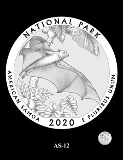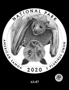 AS-09 highlights the Samoan Fruit Bat, native to American Samoa. American Samoa is the only American locale where this unique animal, a significant mythological symbol of the ancient Samoan culture, lives. The bat is artistically juxtaposed with a stylized scene of a Samoan seashore.