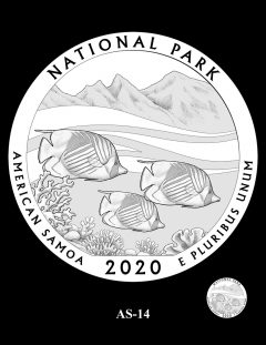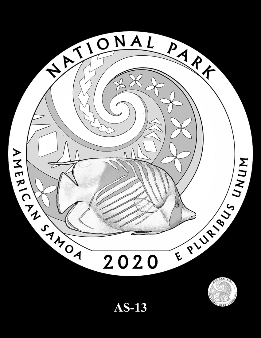 AS-13 portrays a Threadfin Butterflyfish – a tropical fish common to American Samoa, and the reefs around the National Park of American Samoa. The design in the background is a Polynesian symbol of a wave, common to the Samoan tradition of Tatoo within the wave design.
