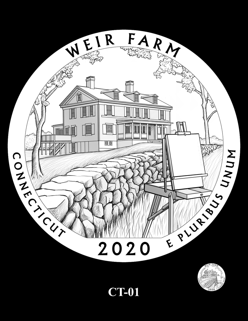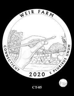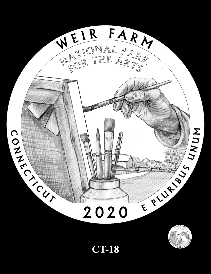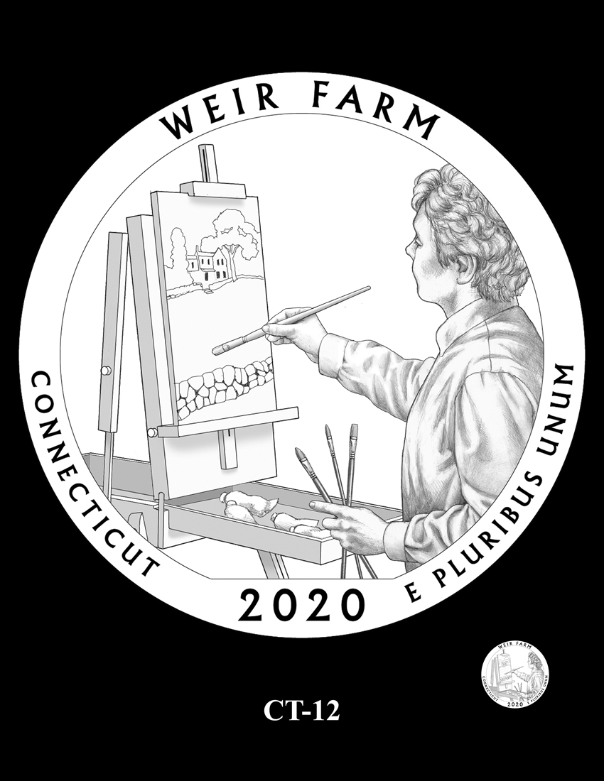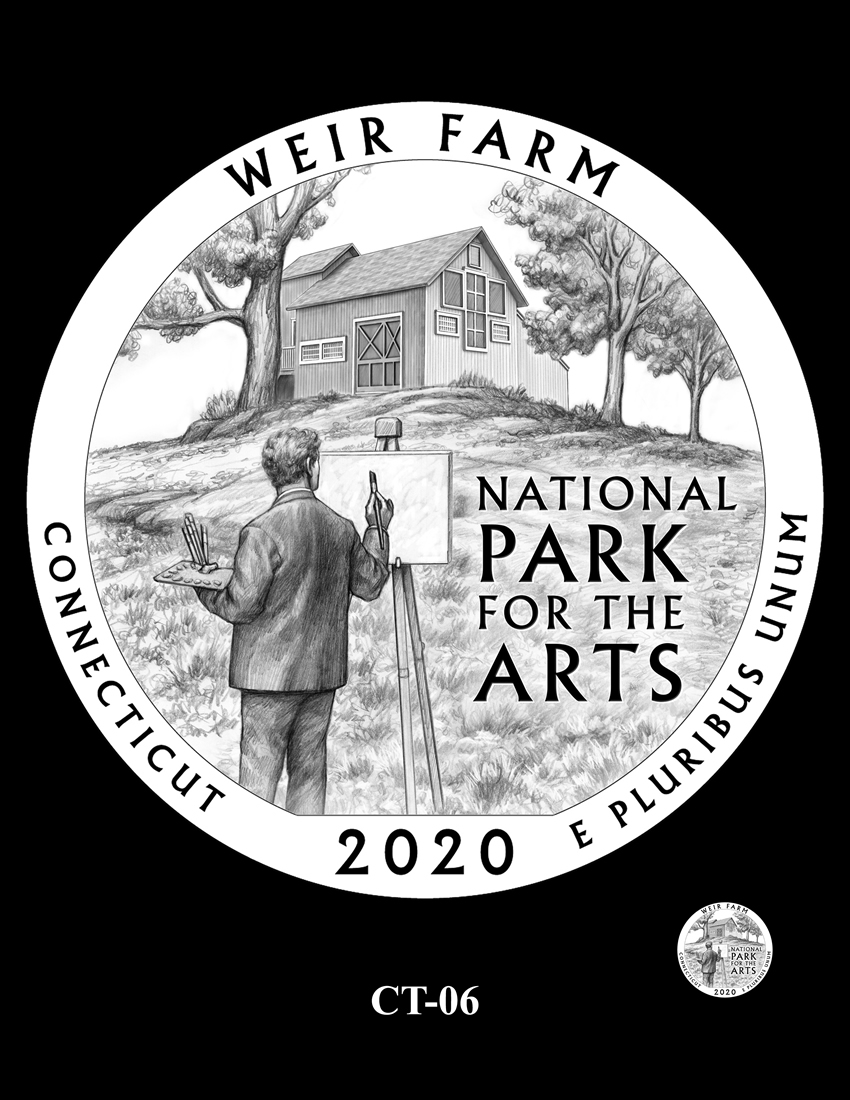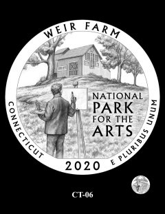 CT-06 portrays J. Alden Weir painting outside his studio at Weir Farm. It is inspired by various images of the studio and his paintings created on the property, as well as descriptions of Weir and his fellow artists absorbing creative and aesthetic inspiration from the rural environment. The design allows the viewer to feel as if he or she is standing where Weir stood. The inscription "National Park for the Arts" is included.