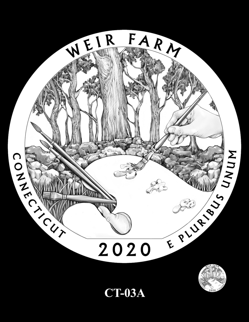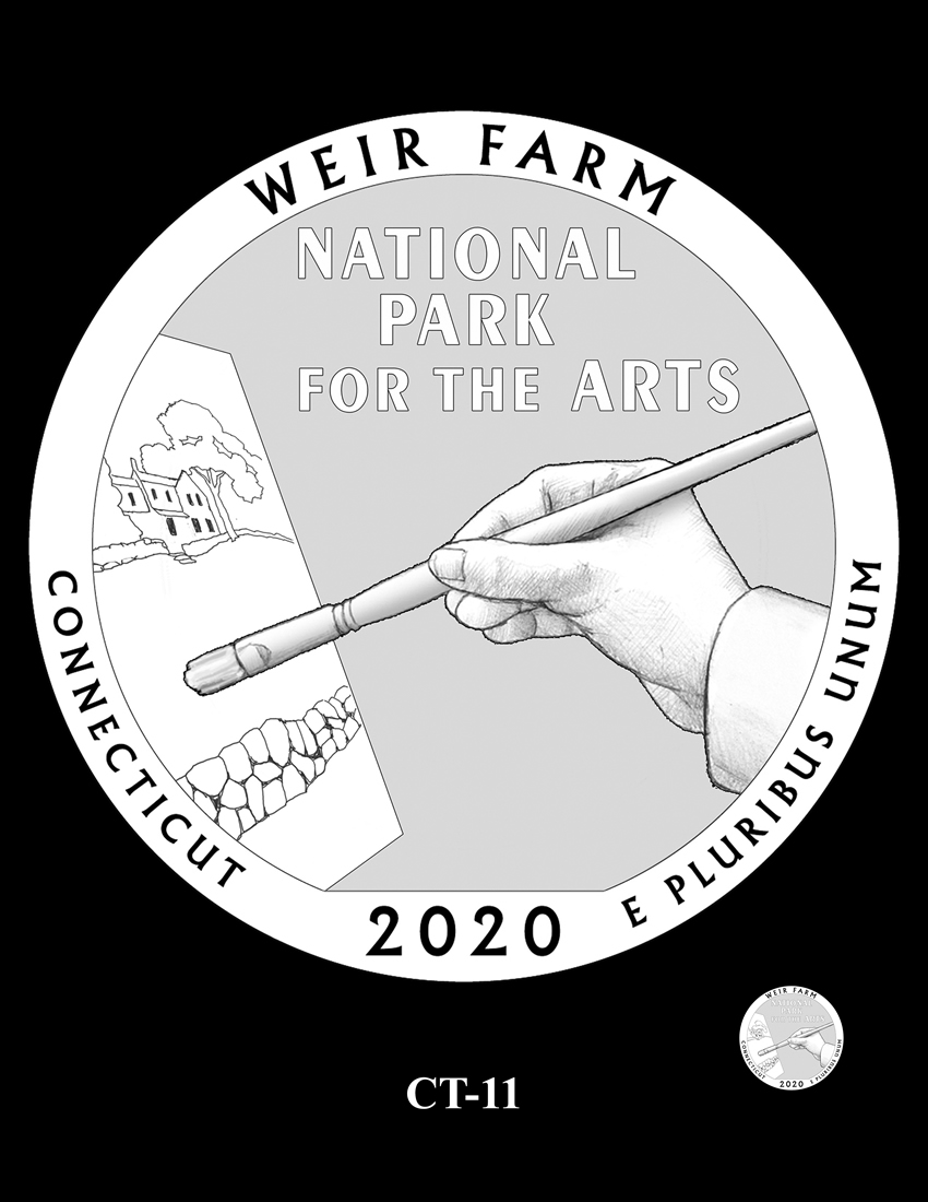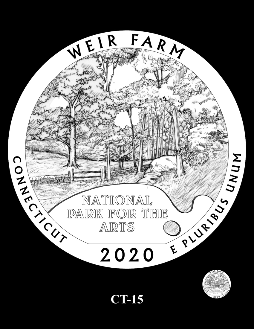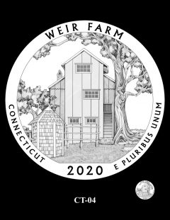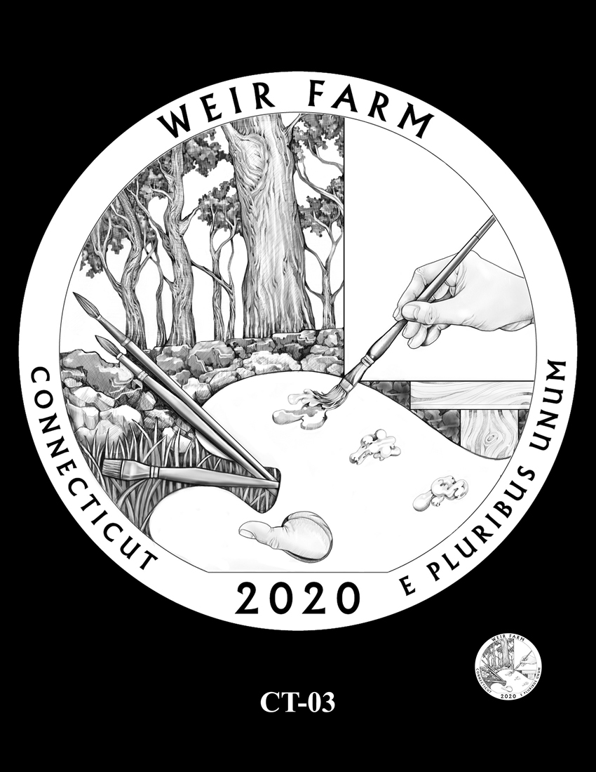 CT-06 portrays J. Alden Weir painting outside his studio at Weir Farm. It is inspired by various images of the studio and his paintings created on the property, as well as descriptions of Weir and his fellow artists absorbing creative and aesthetic inspiration from the rural environment. The design allows the viewer to feel as if he or she is standing where Weir stood. The inscription "National Park for the Arts" is included.