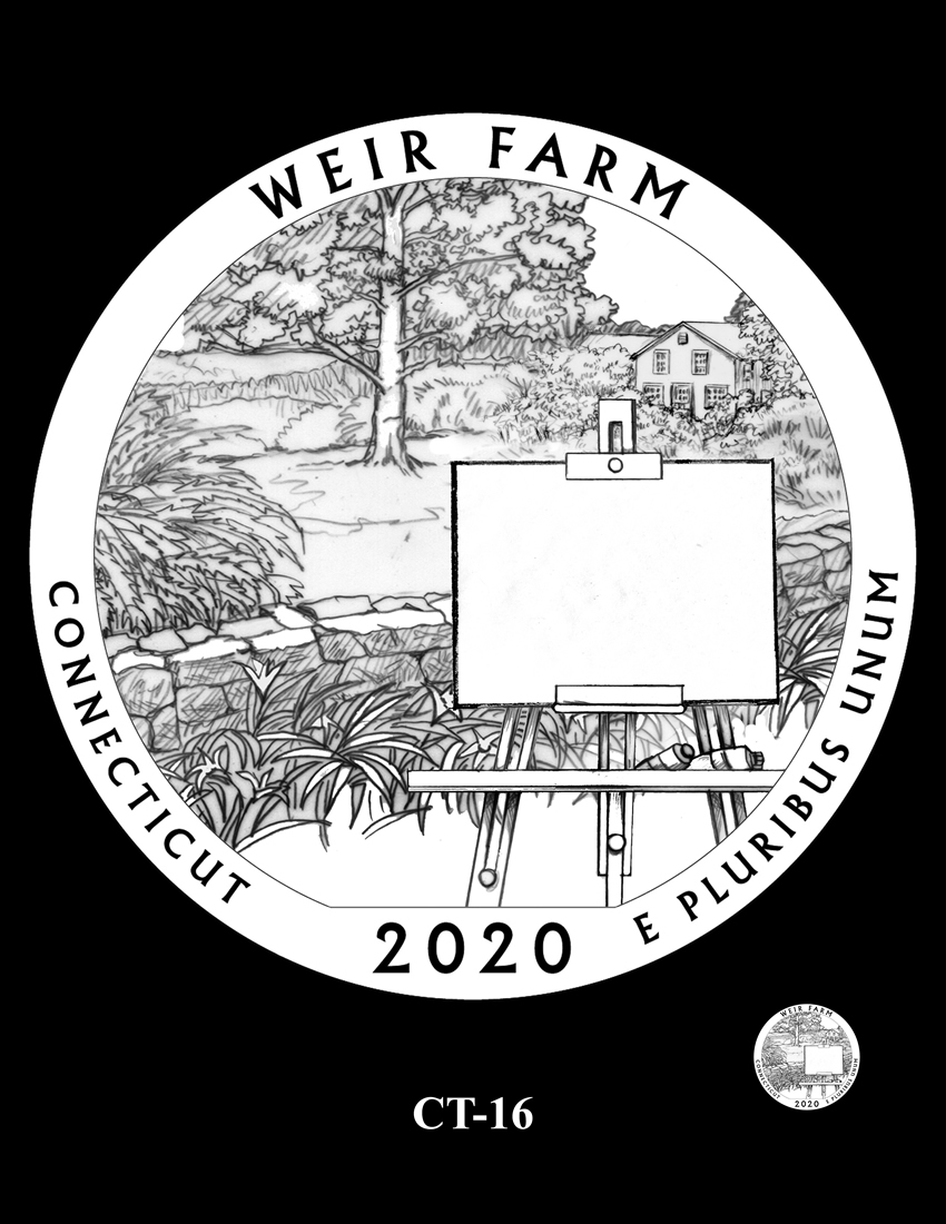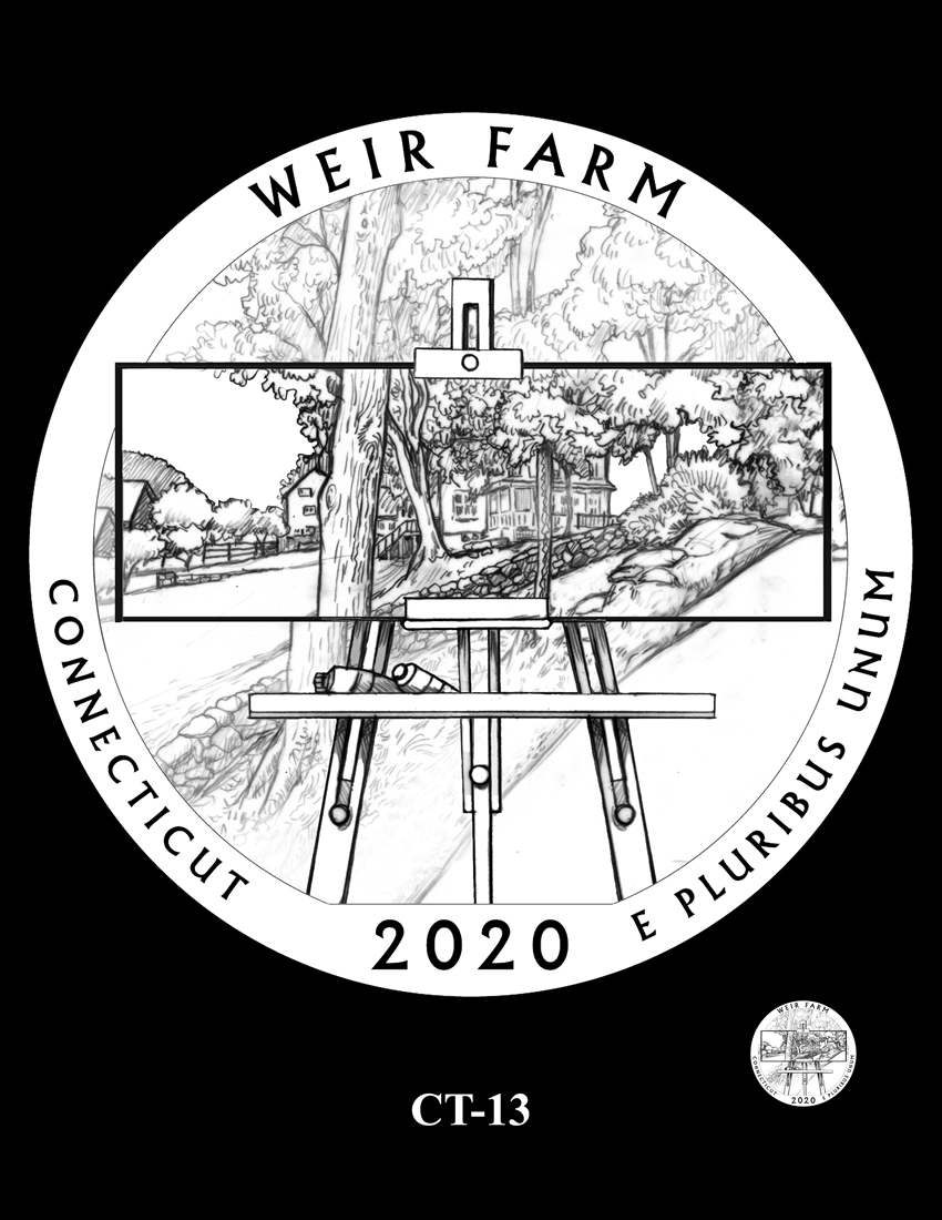 CT-13 and CT-14 portray a portable easel holding a canvas with the artist’s painting of the scene overlaying the actual landscape at Weir Fam. This scene is of the area behind the main house and shows the studio. The canvas and easel are portrayed in greater detail than the rest of the design, underscoring the mission of the site: specifically to create a legacy of artistic expression.
