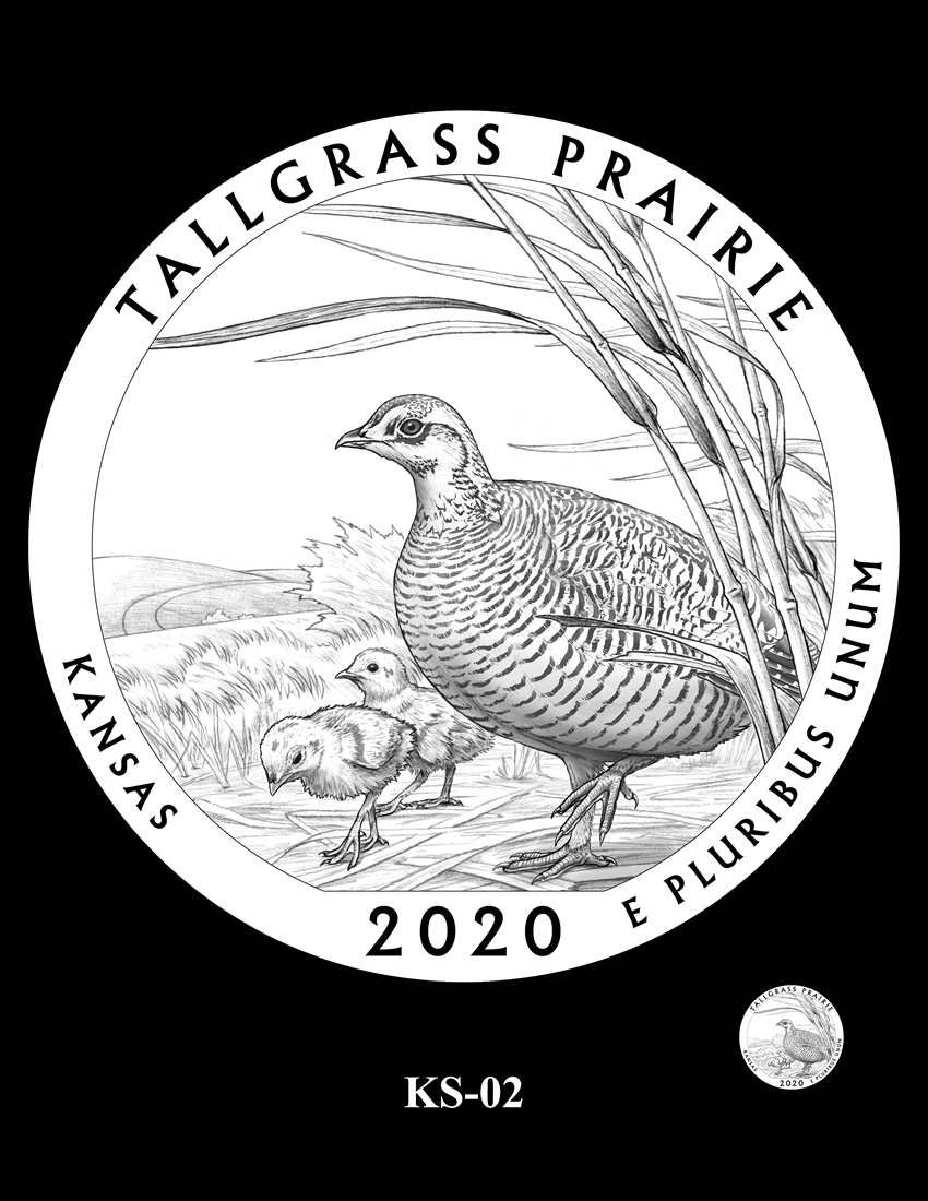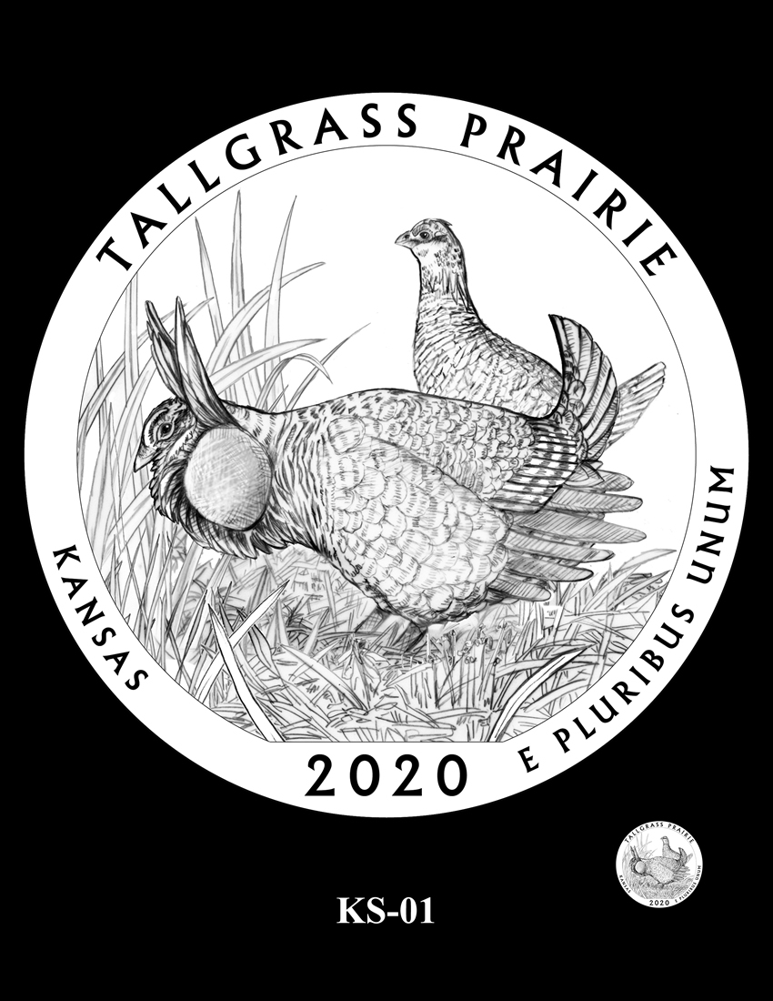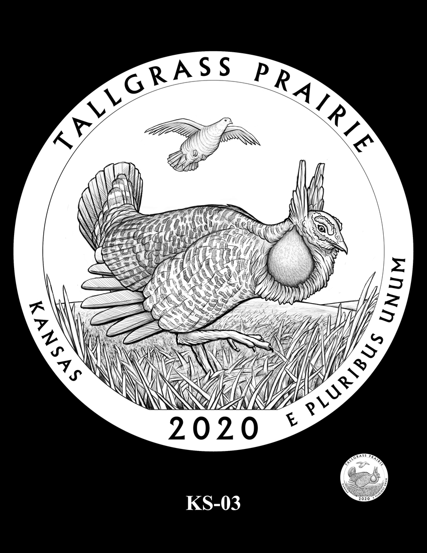 KS-01 features a pair of Greater Prairie Chickens in the tall grass, where their habitat remains protected by the Preserve.