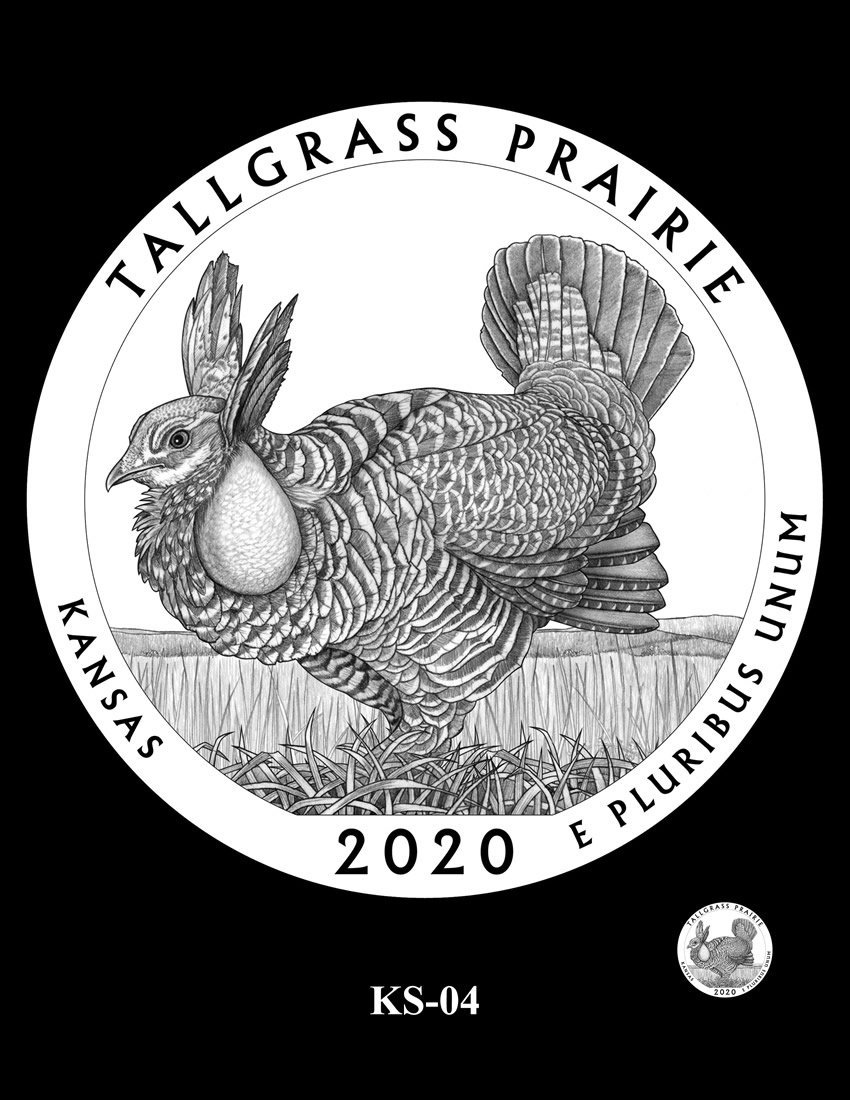 KS-04 portrays a male Greater Prairie Chicken in its habitat. The tallgrass prairie is visible in the background.