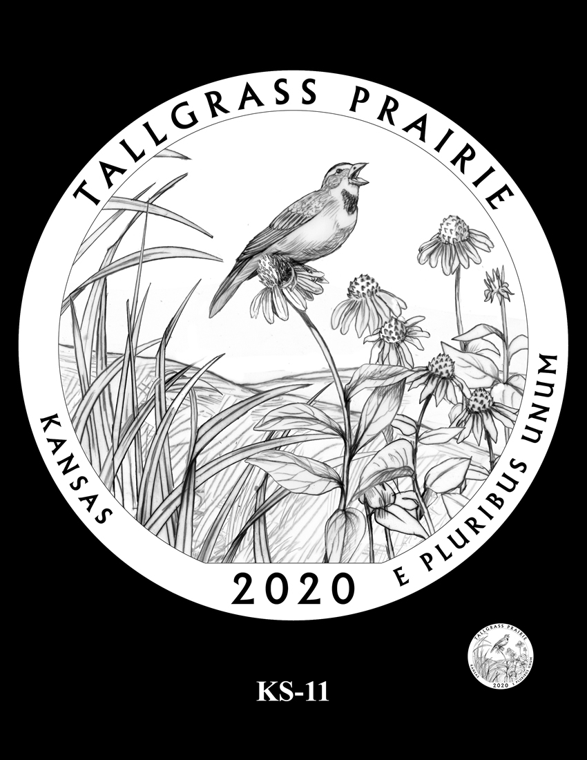 KS-11 depicts a Dickcissel songbird perched on a purple cone flower, one of over 300 species of wildflowers found on the tallgrass prairie. The sloping hills of the prairie are seen in the background.