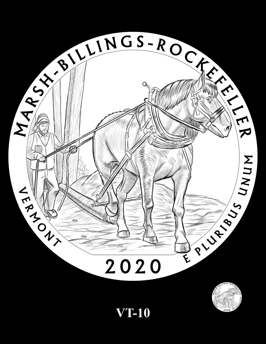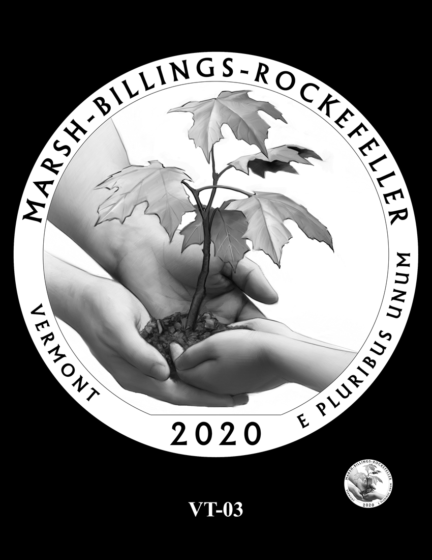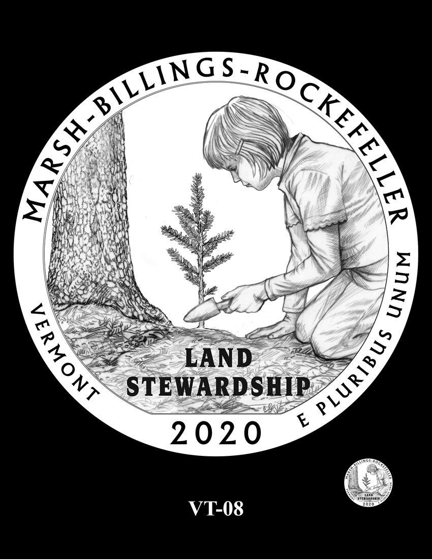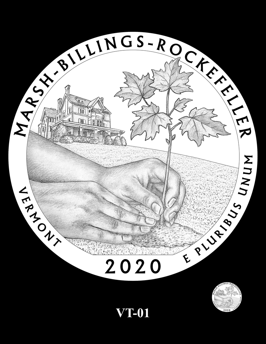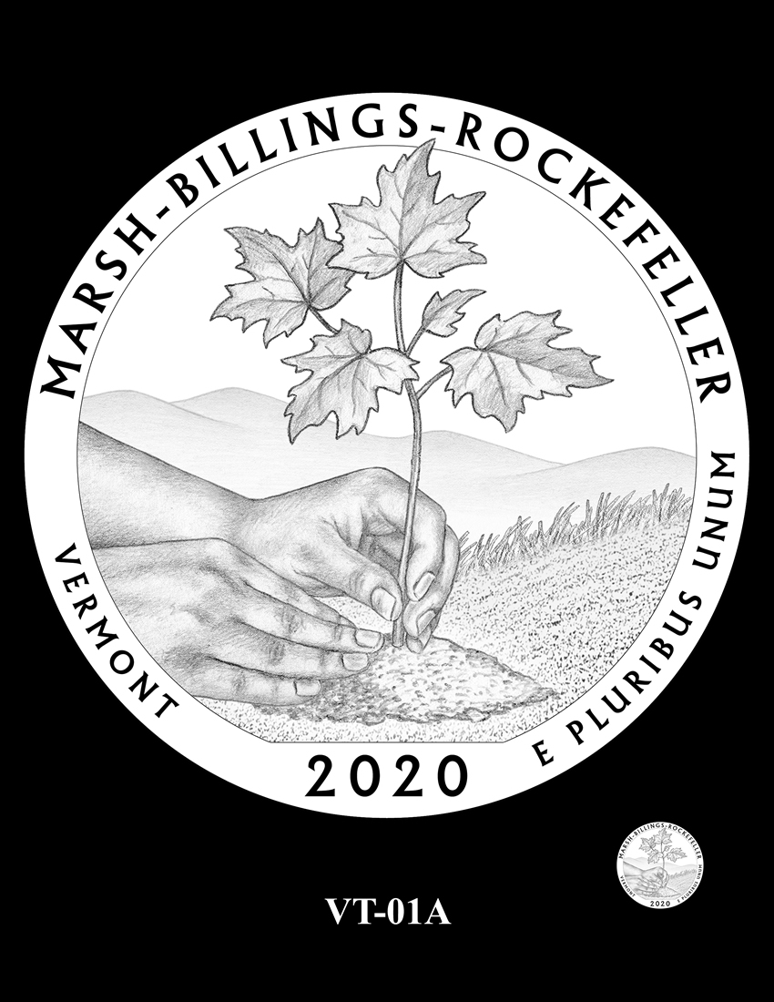 VT-01 and VT-01A depict the planting of a sugar maple sapling, representing the regeneration and conservation of the forests. In the background, design 01 includes the Marsh-Billings-Rockefeller Mansion on a hill, while design 01A portrays a grassy hillside with the Green Mountains.