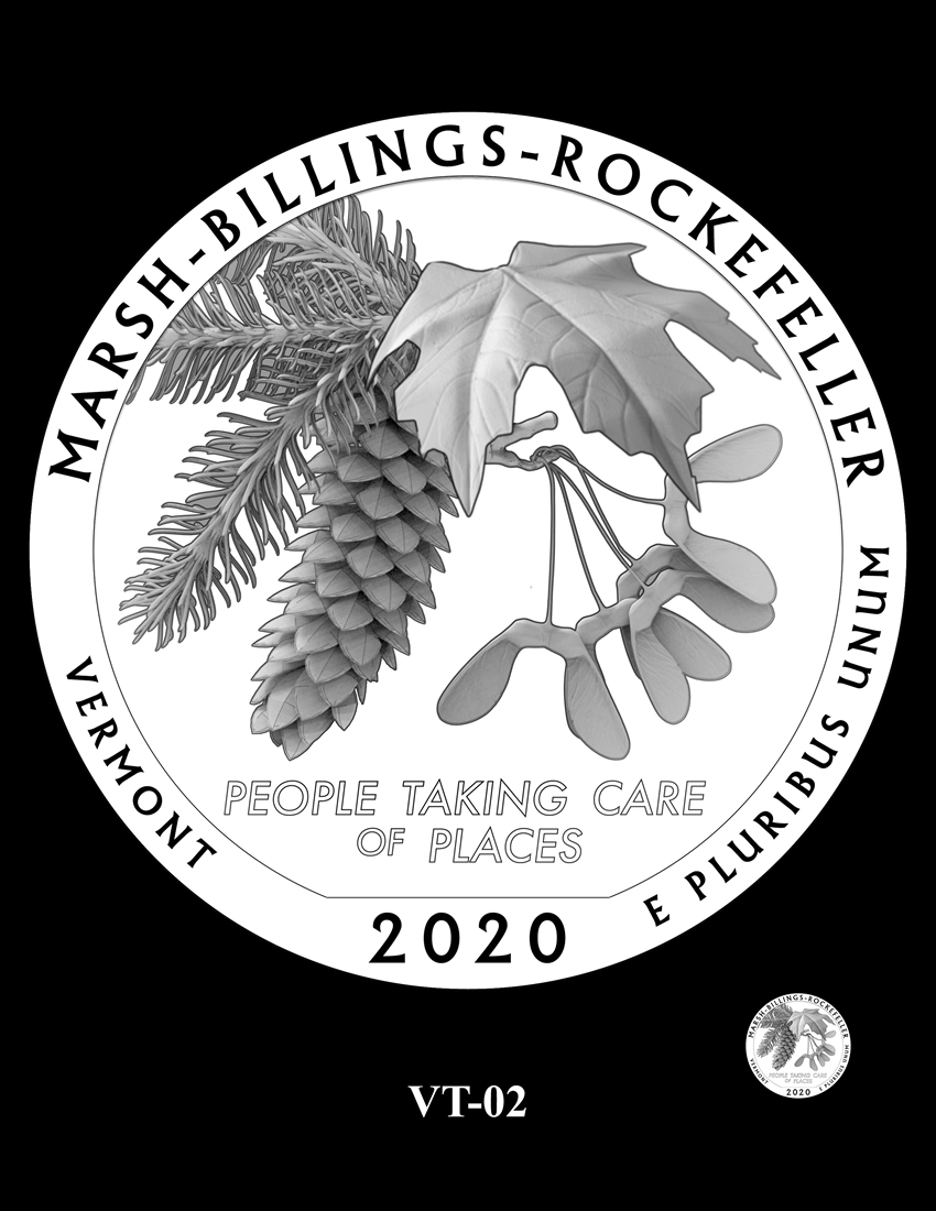 VT-02 features branches of a Norway spruce and a sugar maple with seeds, representing both the present and the hope for the future. The inscription "PEOPLE TAKING CARE OF PLACES" illustrates the commitment to conservation and stewardship demonstrated by the Marsh, Billings, and Rockefeller families.