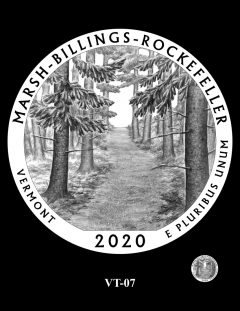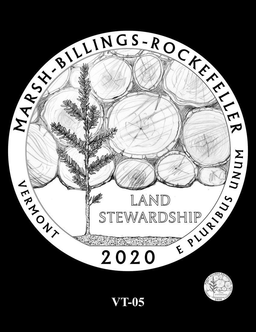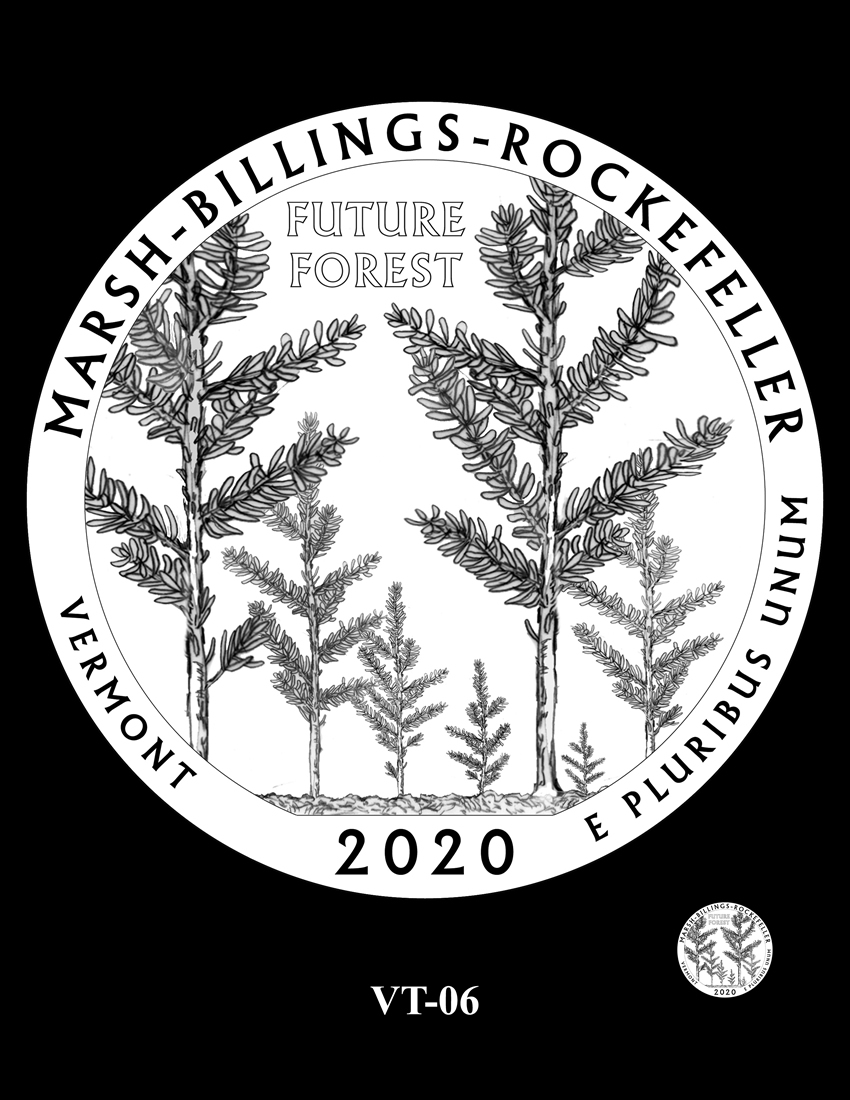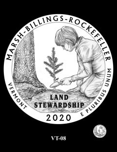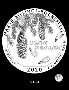 VT-04 features branches of a Norway spruce, with the seeds being released from the cones, symbolically continuing the ideas of George Marsh and Frederick Billings in conservation and sustainability. The inscription "LEGACY OF CONSERVATION" completes the design.