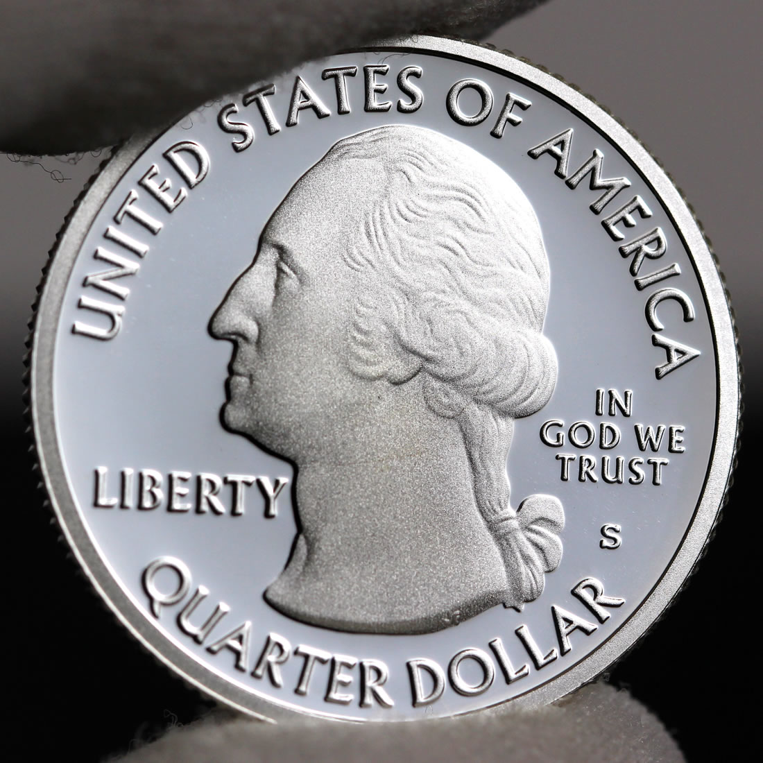 The United State Mint facility in San Francisco produces proof quarters and they carry an ‘S’ mintmark on their obverse. Clad proofs are made from the same composition as regular circulating quarters — 8.33% with the balance copper. Their sharp reliefs and mirror-like backgrounds set them apart from circulating coins.