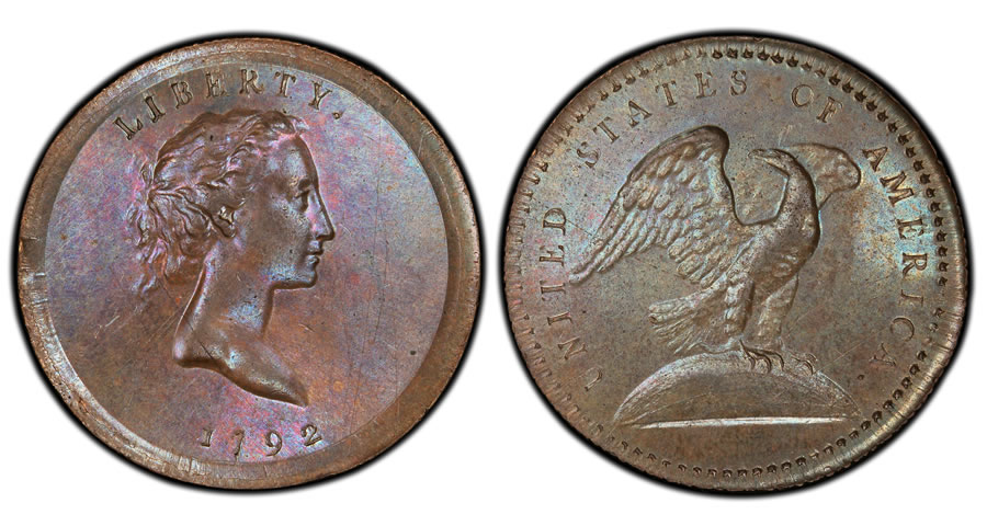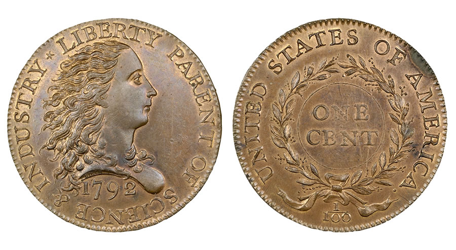 The 1792 Birch cent (Judd-4) is the finest of the seven known examples of the historic prototype large cent. It is graded NGC MS65 RB, was previously owned by David Rittenhouse, the first Director of the United States Mint, and later was also in the Garrett Collection.