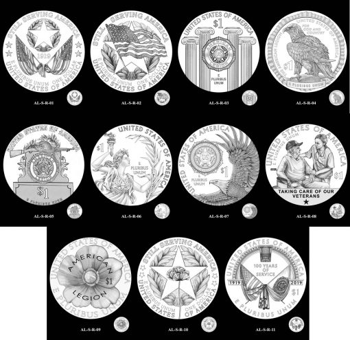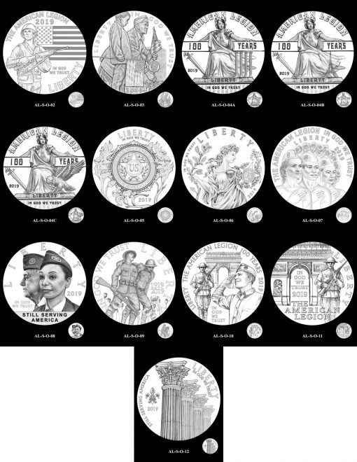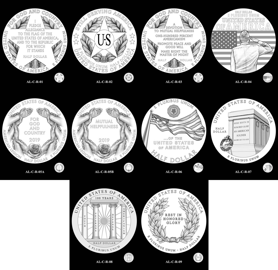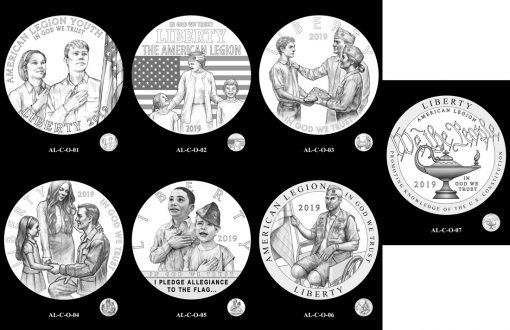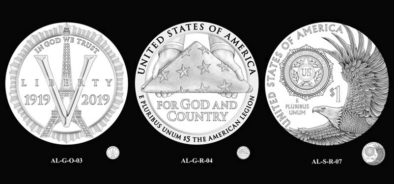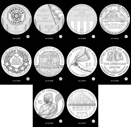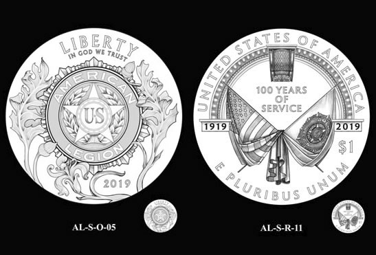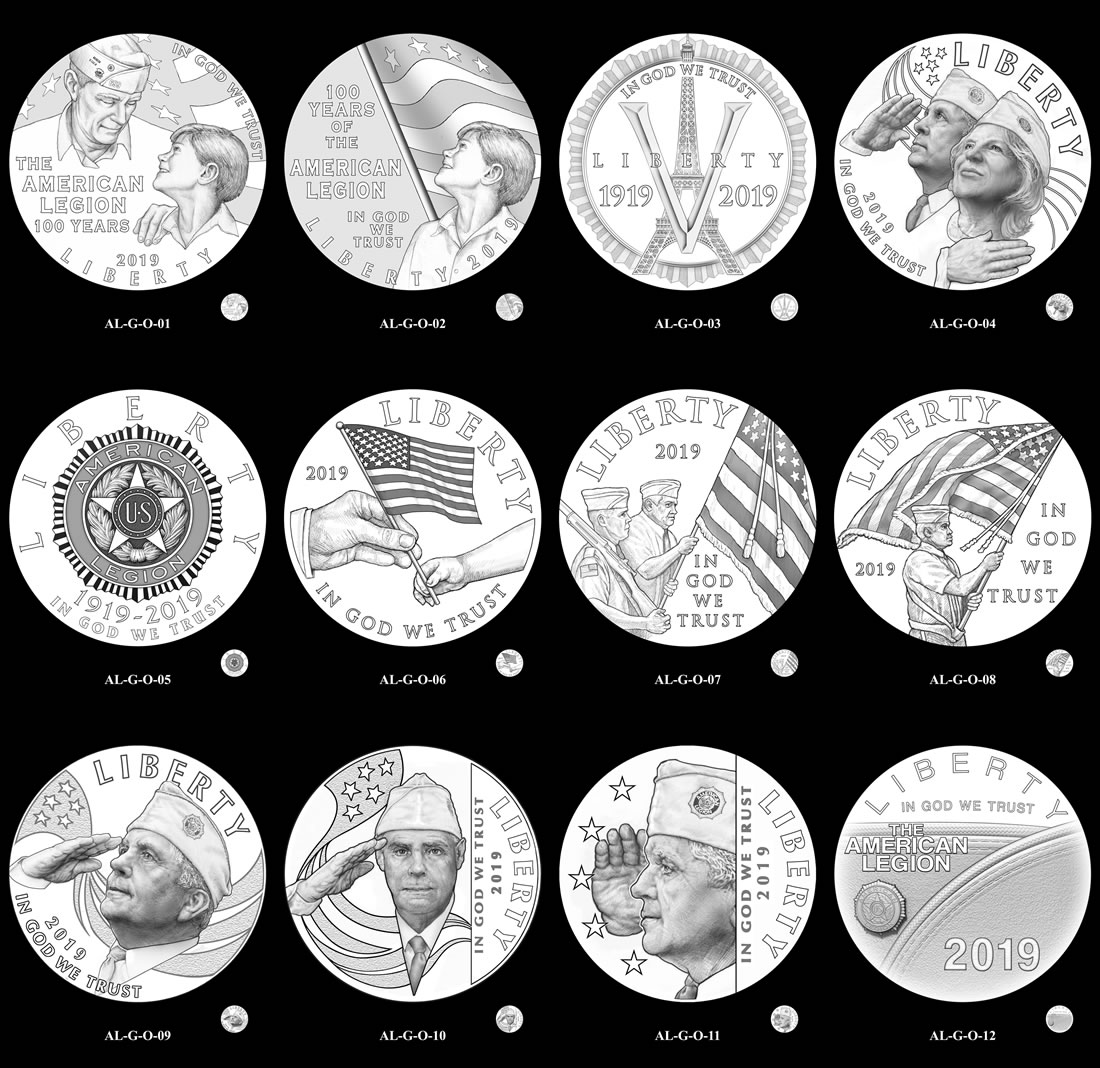 U.S. Mint commemorative coins will be issued in 2019 to celebrate the 100th anniversary of the American Legion. Sixty-three design candidates were created for the commemoratives as part of the process leading to their release.