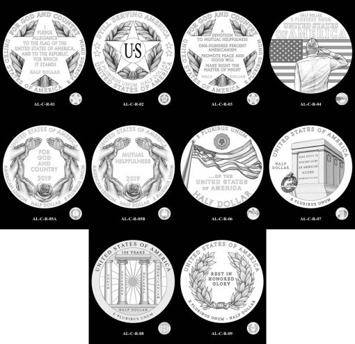 Below are U.S. Mint images and descriptions of the candidate designs for the coins. The Legion’s liaison, CFA and CCAC recommendations are provided as well.