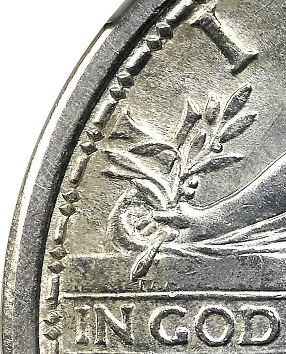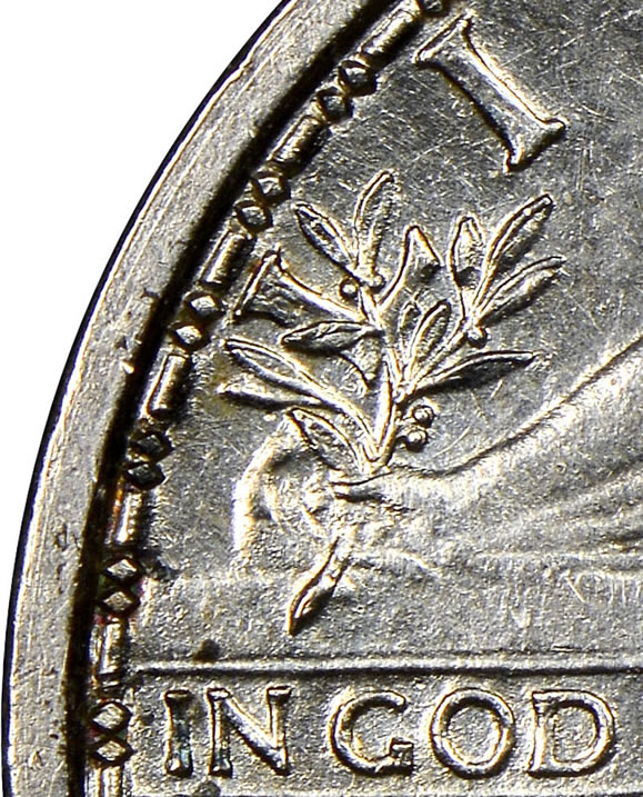 The J-1989 pattern differs from the regular 1916 Standing Liberty Quarter in several ways: It is missing the "M" designer’s initial to the right of the date and it has a different style olive branch near the "L" in "LIBERTY".