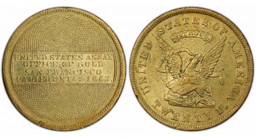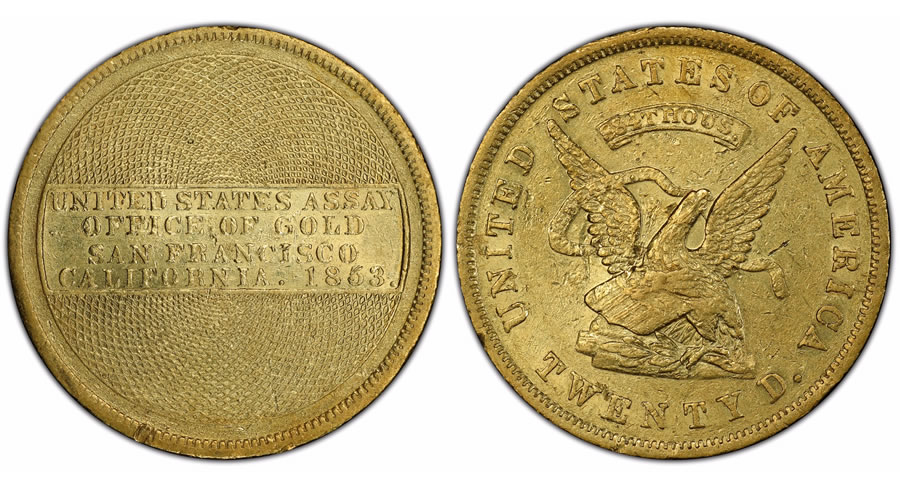 - A rare 1853 U.S. Assay Office $20 "884 THOUS" variety, PCGS AU55+.