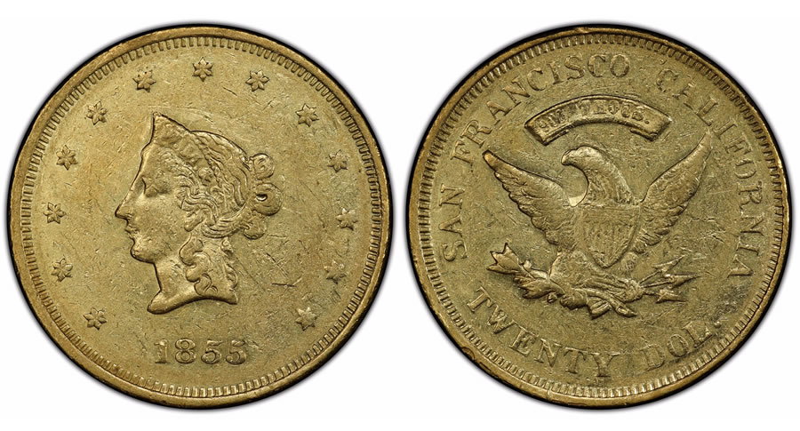 - The second finest known 1855 Kellogg $20, PCGS MS61.