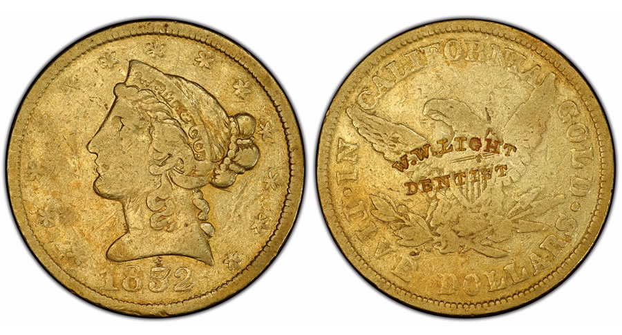 One 1852 Wass Molitor $5 Small Head variety gold coin was counterstamped, "W.W.LIGHT/DENTIST," by a Sacramento, California dentist.