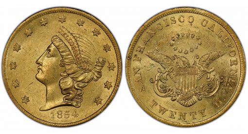 - The second finest known 1854 Kellogg $20, graded PCGS MS62+.