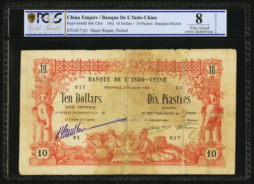 Three notes sold for $33,600, including a Hong Kong and Shanghai Banking Corporation $100 1.4.1948 Pick 176e,which nearly tripled its high pre-auction estimate. Selling for the same price were a Chinese Deutsch-Asiatische Bank Tientsin 20 Taels 1.3.1907 Pick S303s Specimen, the first Specimen on the Deutsch-Asiatische Bank offered by Heritage Auctions, and a Chinese Banque de l’Indo-Chine 10 Piastres = $10 15.1.1902 Pick S440B, which was part of a small issuance because of the French bank’s inability to compete with the capital base of British Merchant banks, such as the HSBC.