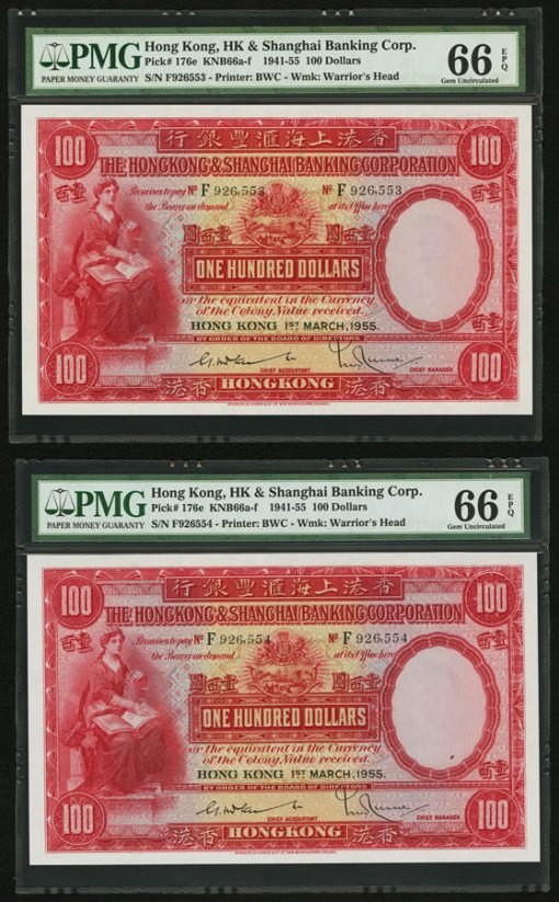 A Hong Kong & Shanghai Banking Corporation 1955 $100 Consecutive Pair brought $21,600 while another Hong Kong and Shanghai Banking Corporation $100 1.3.1955 Pick 176e Two Consecutive Serial Number Examples realized $20,400. Each result more than doubled its low pre-auction estimate.
