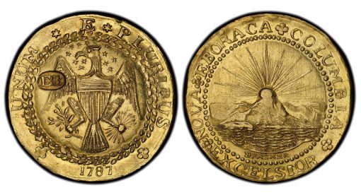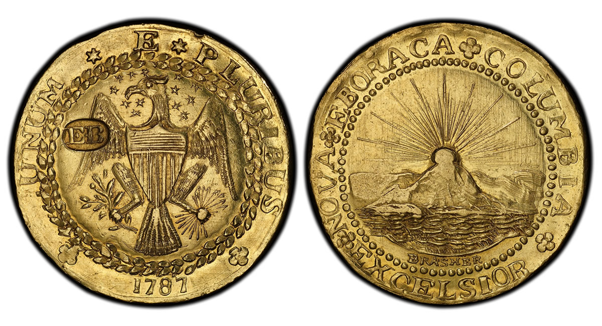 The Brasher Doubloons are the first gold coins made in the United States proposed or intended for circulation. The design includes the obverse motto, NOVA EBORACA COLUMBIA EXCELSIOR (translated as "New York and America ever upward").