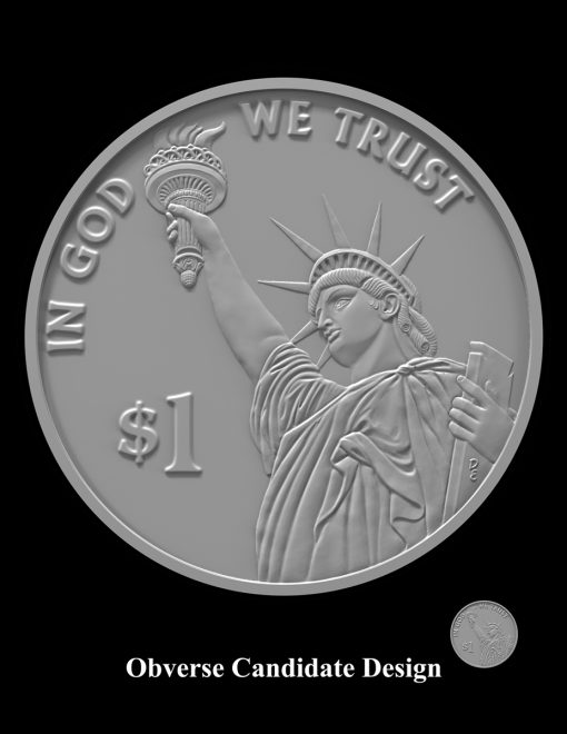 The U.S. Mint’s candidate for the obverse features a reworking of Don Everhart’s Statue of Liberty design that appeared on reverses of Presidential $1 Coins from 2007 to 2016.