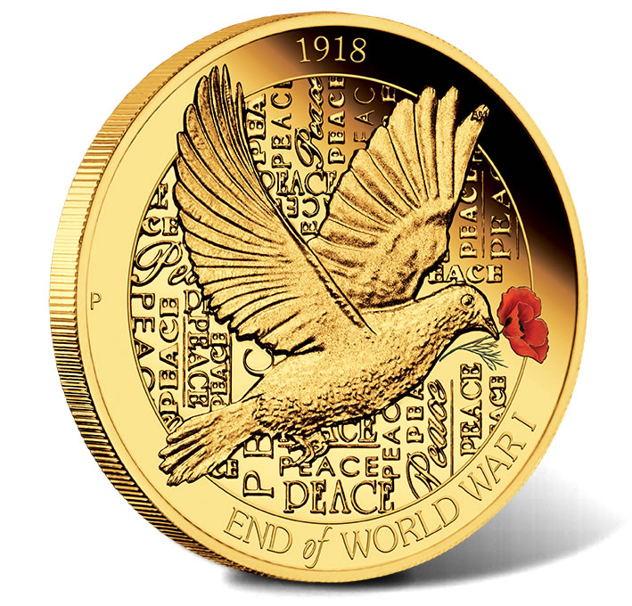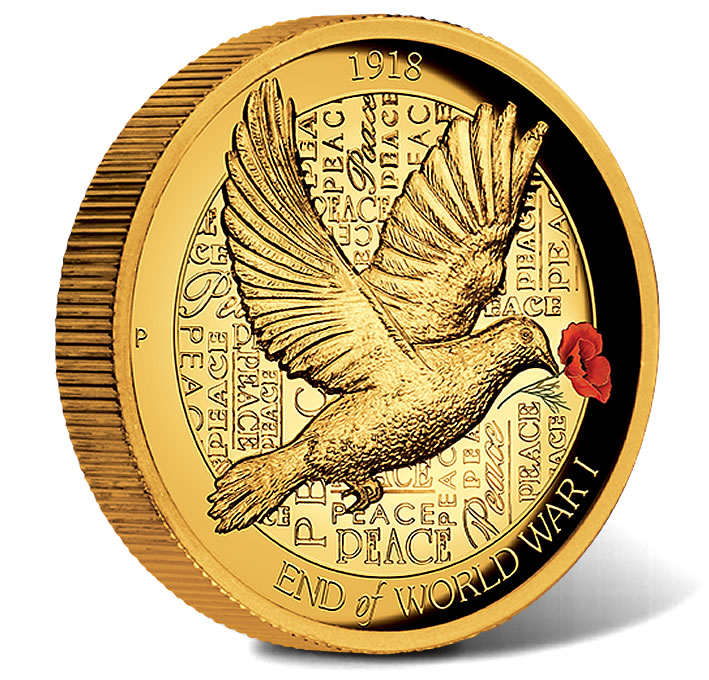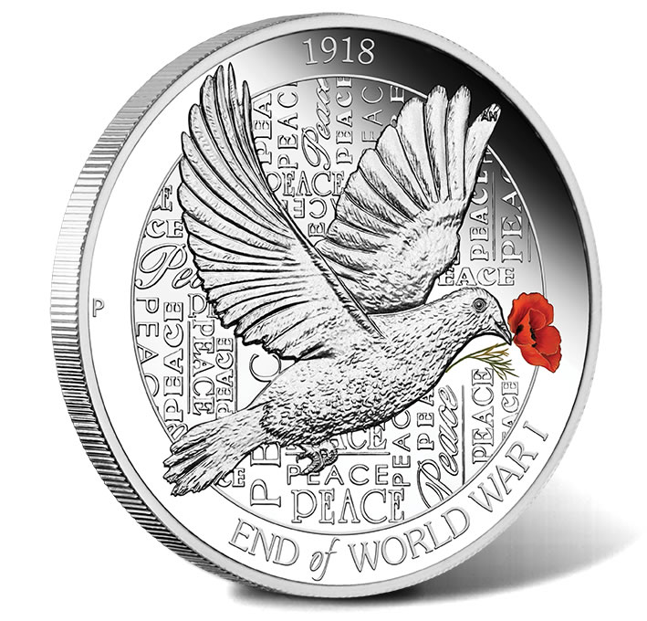 Featured on each coin’s reverse is a dove, a bird which has for millennia represented peace, holding in its beak a red poppy. Poppies were the first flowers to bloom in the devastated battlefields of Western Europe and soon became widely accepted as the symbol of remembrance. In the background is the word peace struck in different fonts,