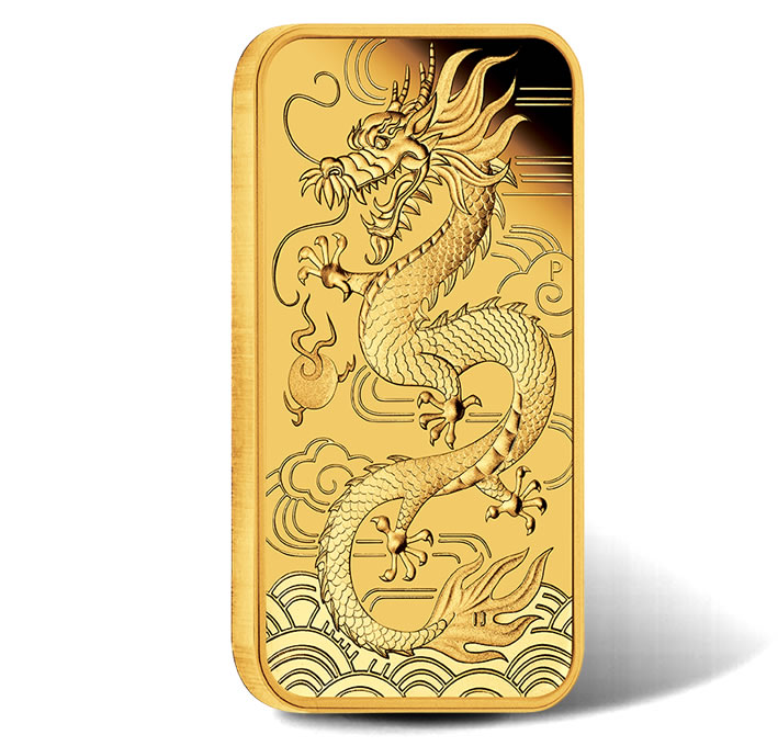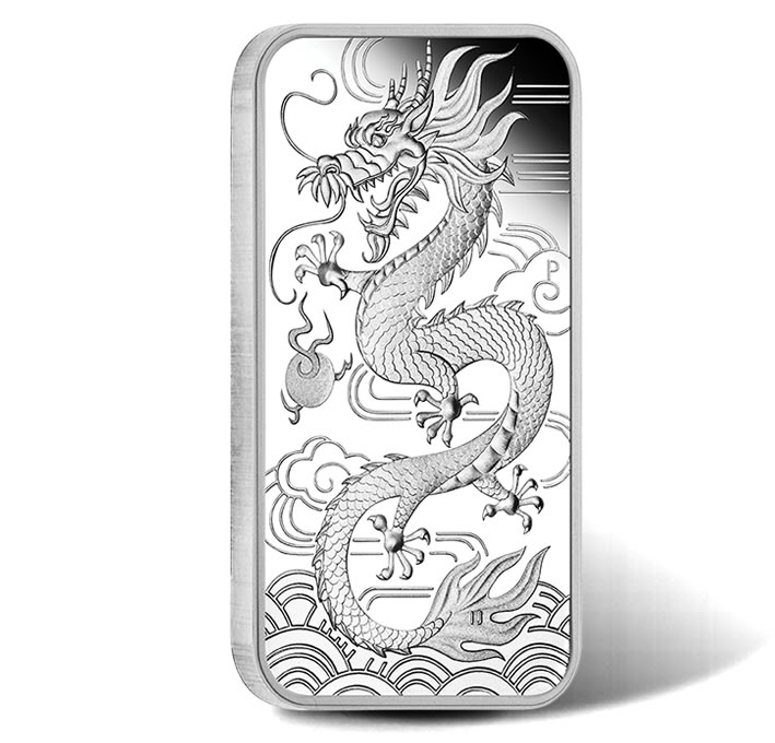 In Chinese culture, the dragon is revered as a divine mythical creature, a symbol of power, strength, wealth, and good fortune, and it is often portrayed alongside a luminous or flaming pearl. The rectangular coins’ reverse depict a stylised Chinese dragon chasing a flaming pearl, with wind, clouds and water in the background.
