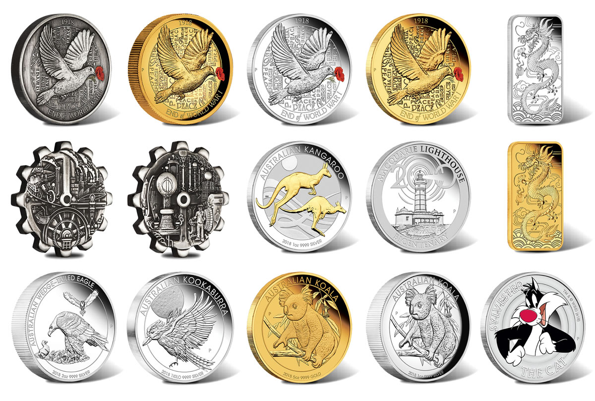 The Mint’s latest offerings showcase designs honoring the 100th anniversary end of World War I, the evolution of industry, and the bicentenary of the Macquarie Lighthouse. More traditional-themed designs are also featured, including those depicting kangaroos, koalas, wedge-tailed eagles and dragons.