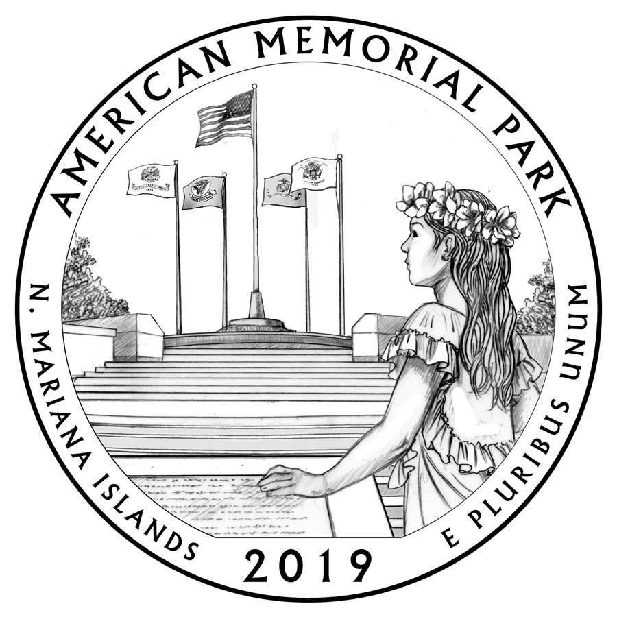 This design depicts a young Chamorro woman in traditional dress at the front of the Flag Circle and Court of Honor. She is resting her hand on the plaque whose text honors the sacrifice of those who died in the liberation of Saipan. Inscriptions are "AMERICAN MEMORIAL PARK," "N. MARIANA ISLANDS," "2019," and "E PLURIBUS UNUM."