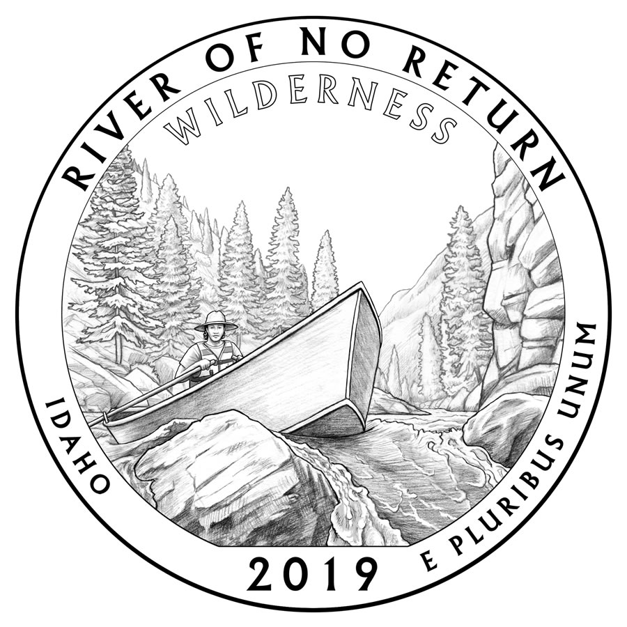 This design depicts a piloted drift boat on the rushing river encompassed by the trees and rock formations of the Wilderness. Inscriptions are "RIVER OF NO RETURN," "WILDERNESS," "IDAHO," "2019," and "E PLURIBUS UNUM."