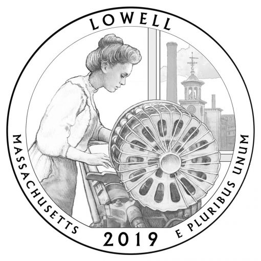 This design depicts a mill girl working at a power loom with its prominent circular bobbin battery. A view of Lowell, including the Boott Mill clock tower, is seen through the window. Inscriptions are "LOWELL," "MASSACHUSETTS," "2019," and "E PLURIBUS UNUM."