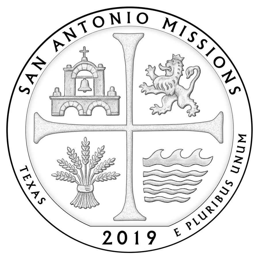 This design depicts elements of the Spanish Colonial Real coin to pay tribute to the missions. Within the quadrants are symbols of the missions: wheat symbolizes farming, the arches and bell symbolize community, a lion represents Spanish cultural heritage, and a symbol of the San Antonio River represents irrigation methods and life-sustaining resources. Inscriptions are "SAN ANTONIO MISSIONS," "TEXAS," "2019," and "E PLURIBUS UNUM."