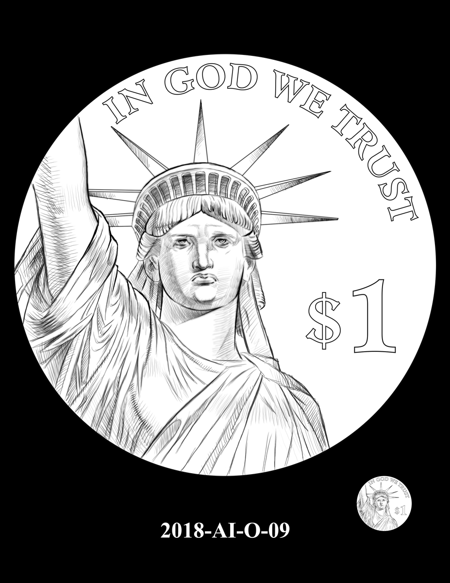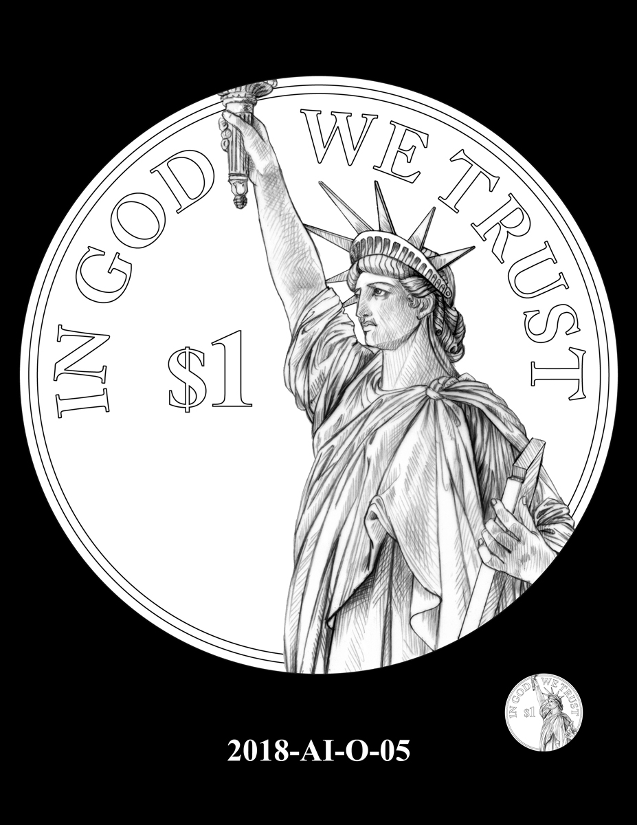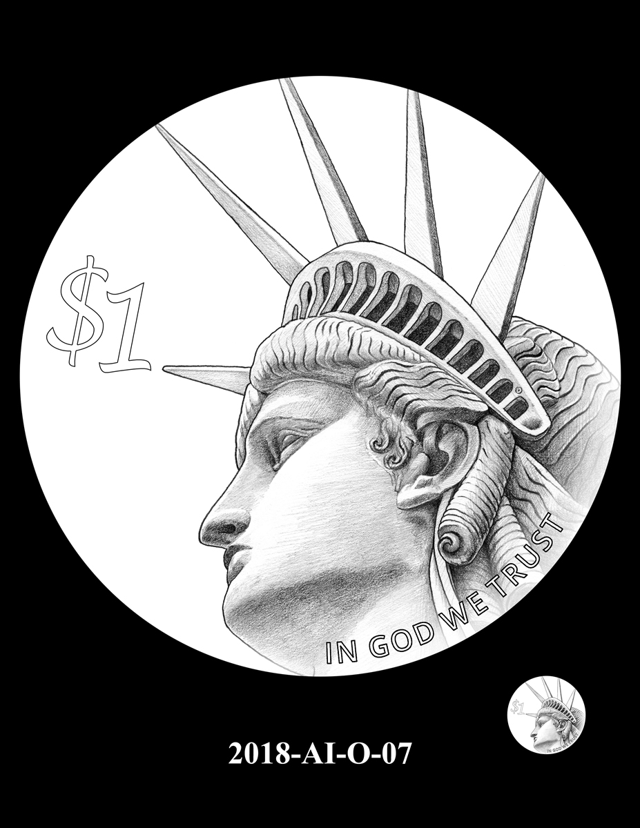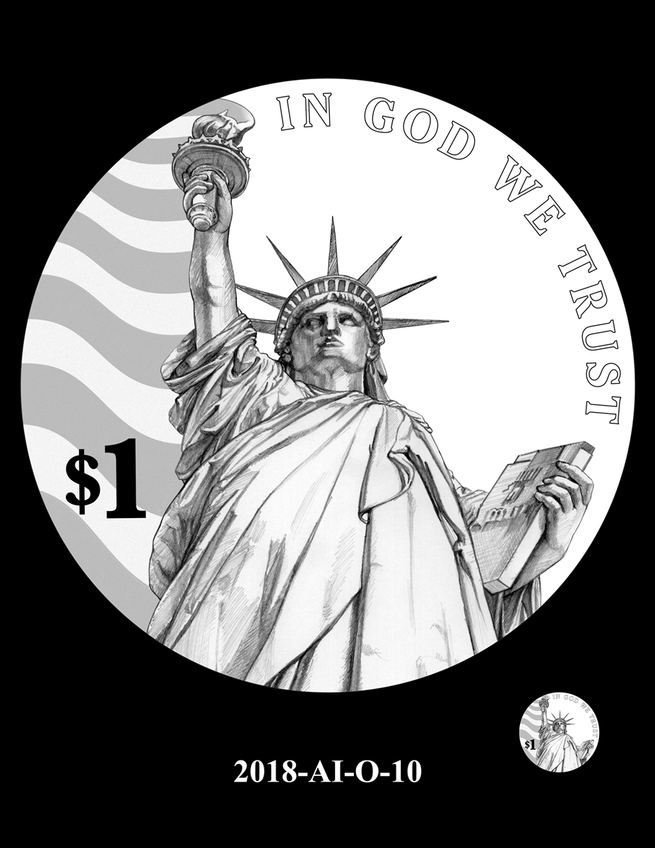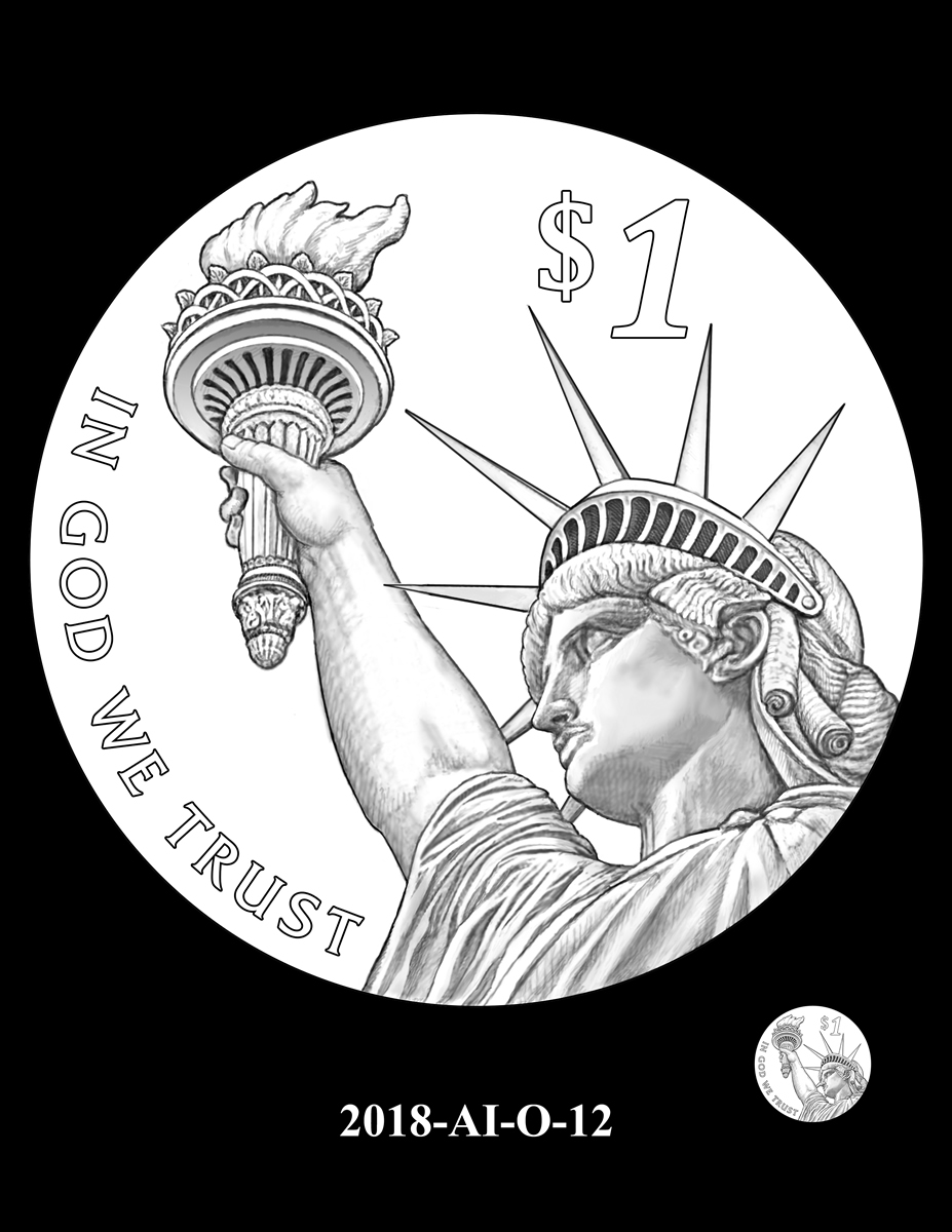 The obverse designs feature images of the Statue of Liberty. The common obverse design for this program, per Public Law 115-197, must feature "a likeness of the Statue of Liberty extending to the rim of the coin and large enough to provide a dramatic representation of Liberty," as well as the inscriptions "$1" and "In God We Trust."