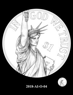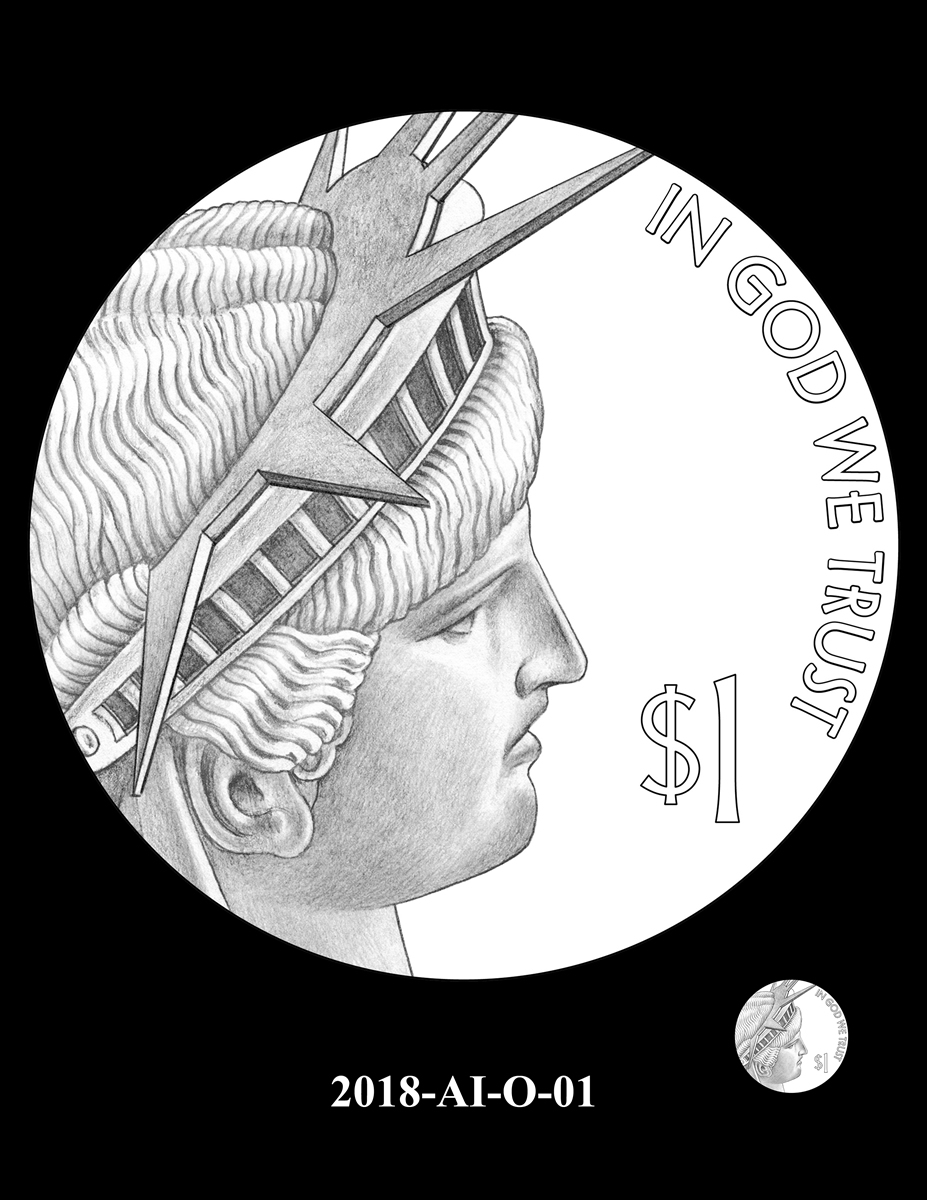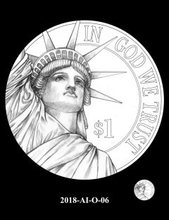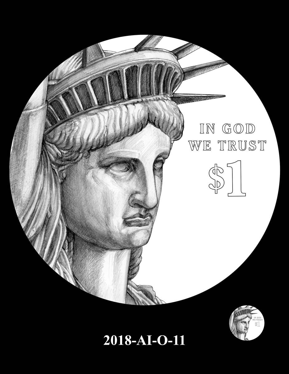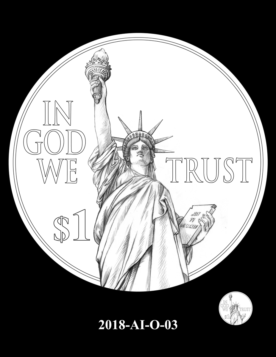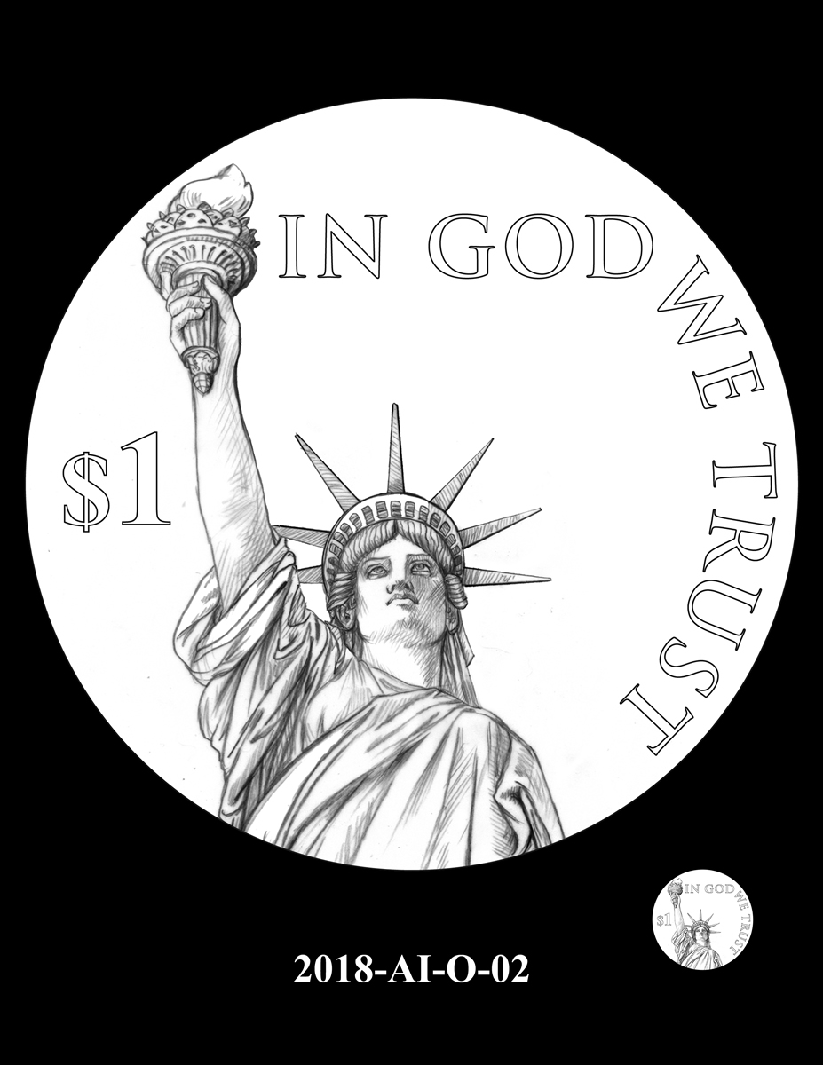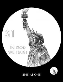 The obverse designs feature images of the Statue of Liberty. The common obverse design for this program, per Public Law 115-197, must feature "a likeness of the Statue of Liberty extending to the rim of the coin and large enough to provide a dramatic representation of Liberty," as well as the inscriptions "$1" and "In God We Trust."