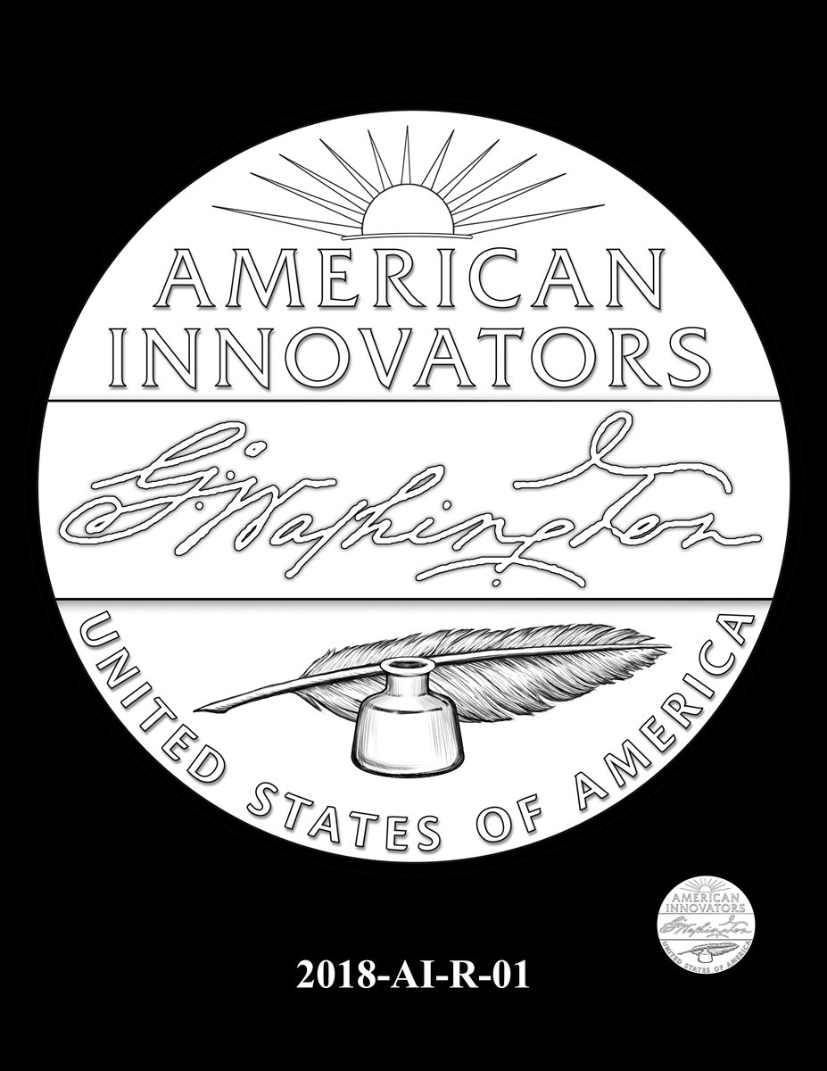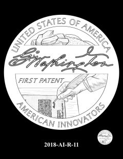 2018-AI-R-01 depicts George Washington’s signature on the first patent along with the inscriptions "American Innovators" and "United States of America." The design also features a quill and inkwell, symbolizing the signing of the patent, and a rising sun, symbolizing the dawning of a new era of progress with the many great innovations coming from America.