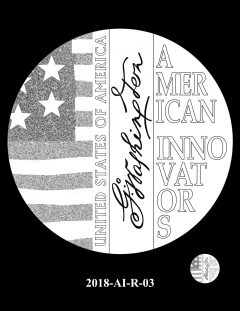 2018-AI-R-03 depicts George Washington’s signature and the inscriptions "United States of America" and "American Innovators." The design also features an image of the 15-star flag that was in use during the early years of the Patent Office.