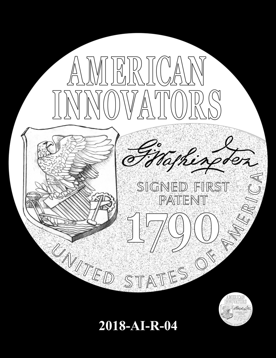 2018-AI-R-04 depicts George Washington’s signature above the inscription "Signed First Patent." Additional inscriptions include "American Innovators," "1790," and "United States of America". The design also features an image of the Patent Office relief found on the Herbert C. Hoover Building in Washington, D.C, the headquarters of the Department of Commerce and once the home of the U.S. Patent and Trademark Office.