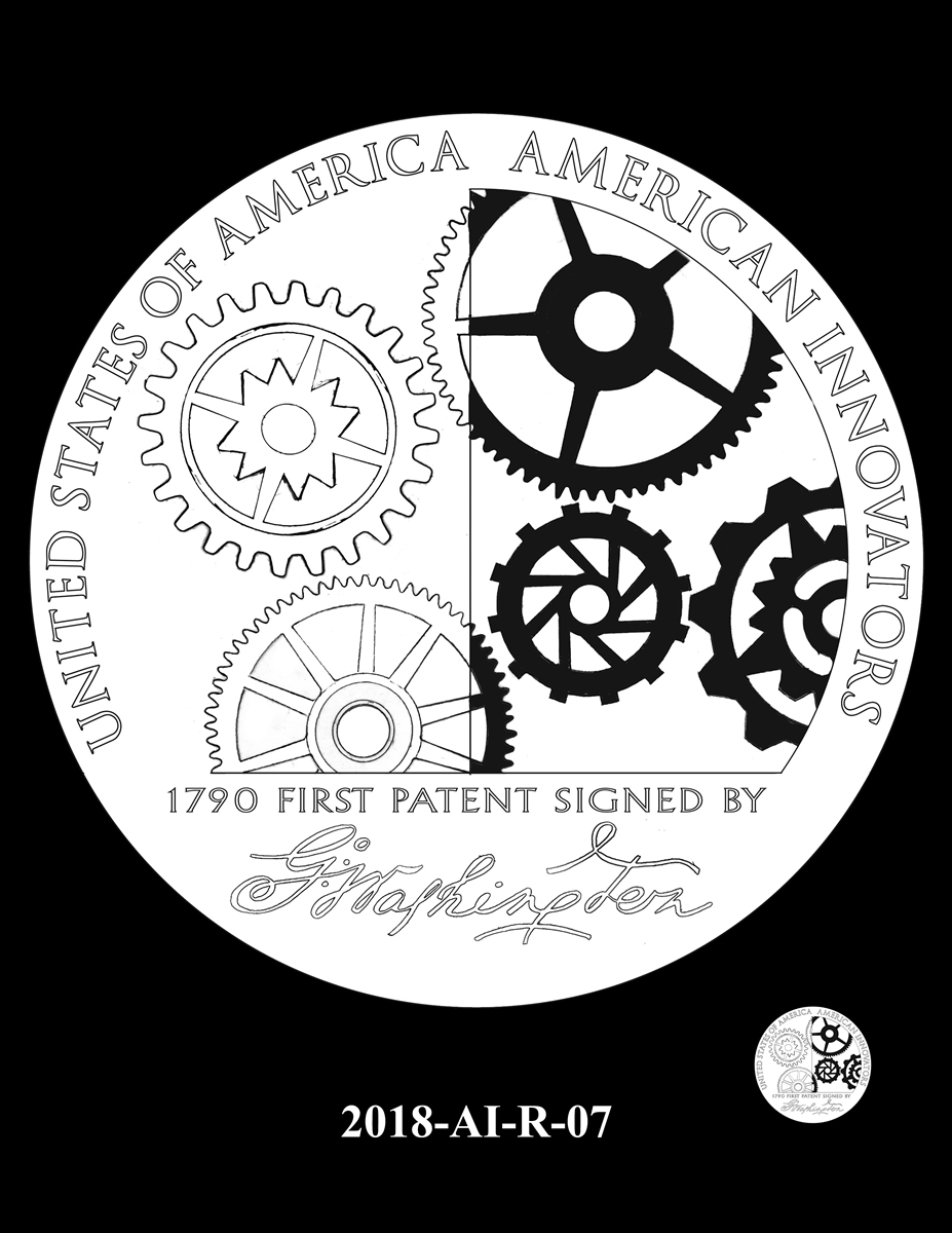 2018-AI-R-05, 2018 AI-R-06, 2018-AI-R-07 and 2018-AI-R-08 feature George Washington’s signature and the inscriptions "American Innovators" and "United States of America." The stylized gears represent industry and innovation. Design 07 features the inscription "1790 First Patent Signed By" above Washington’s signature. Designs 05 and 08 include the inscription "Signed First Patent" under Washington’s signature, with Design 05 also featuring the inscription "1790".