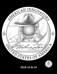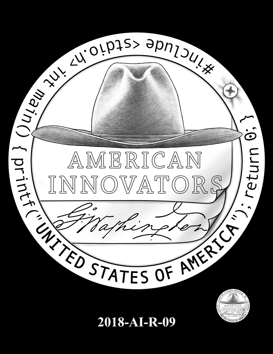 2018-AI-R-09 features George Washington’s signature on the first patent, as if inscribed on a piece of paper, and the inscriptions "American Innovators" and "United States of America." The cowboy hat has come to symbolize an independent spirit and resilient nature. The design also features the American created C computer programming language, shown here as a code to display the words "United States of America." Finally, the Phillips head screw, another American invention, is featured on the border.